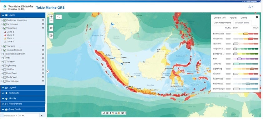 「TM-GRS(Tokio Marine Global Risk Management Support)」は、地図上に契約者の国内外の拠点を表示し、拠点毎の契約情報を確認することができます。更に拠点毎の自然災害リスク(地震・洪水・風災等)のハザードマップやリスク評価に関する情報、リスク調査結果の確認も可能です。東京海上日動は、今後、リアルタイムの気象データや衛星画像を提供する機能拡充を検討していきます。