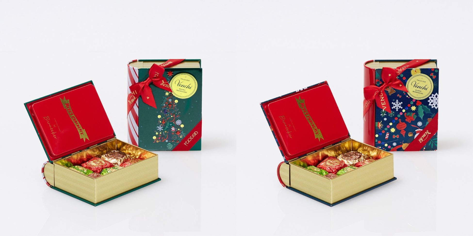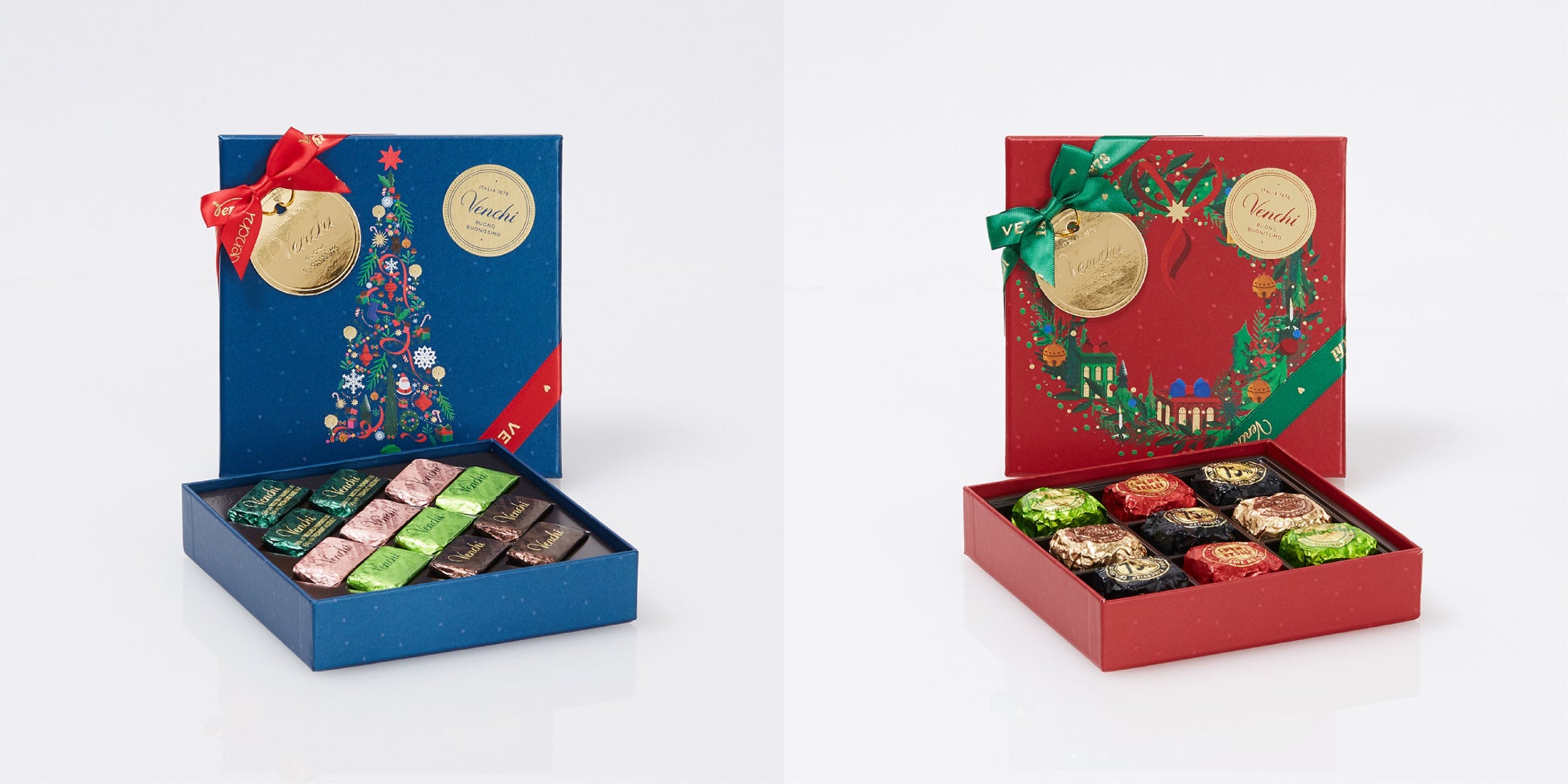 クラシカルな印象のスクエア型のギフトボックス。クリスマスモチーフを散りばめてツリーをデザインした深い青のギフトボックスにはジャンドゥイオット4種類、リースを施した赤いギフトボックスには、ヴェンキを代表するチョコレート「チョコビア」4種が詰まっています。