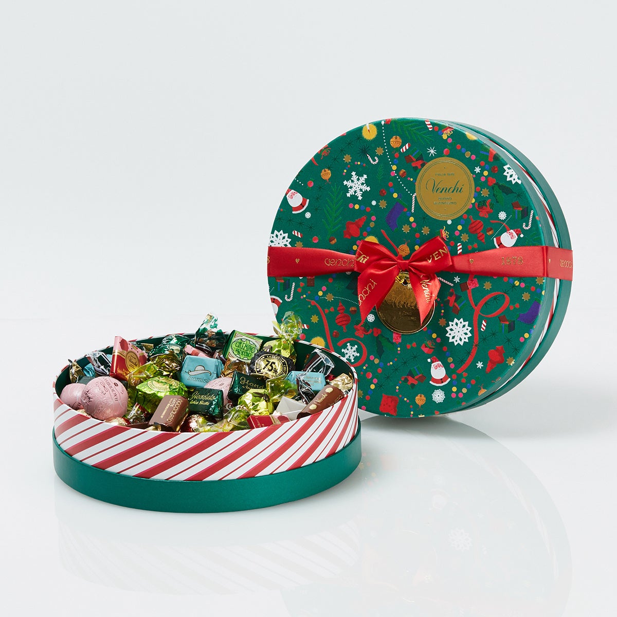 グリーンベースのギフトボックスにクリスマスモチーフをちりばめたデザインのクリスマスハンパー。PICK&MIXで人気のチョコレート14種類62個がアソートされた充実の内容で、ヴェンキのチョコレートの世界を堪能いただけます。