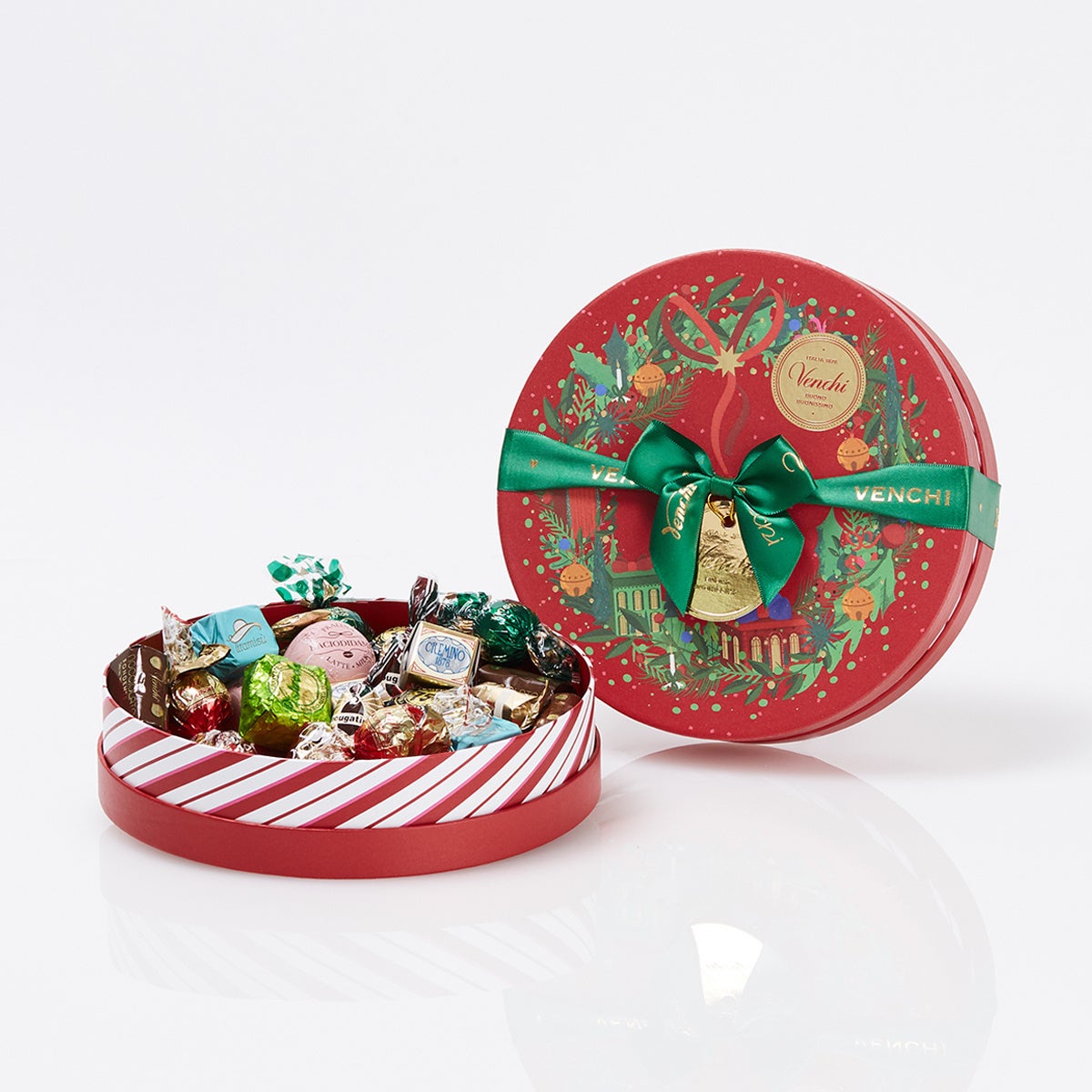 レッドベースのギフトボックスにリースが映えるデザインのクリスマスハンパー。PICK&MIXで人気のチョコレート12種類25個をアソートしています。