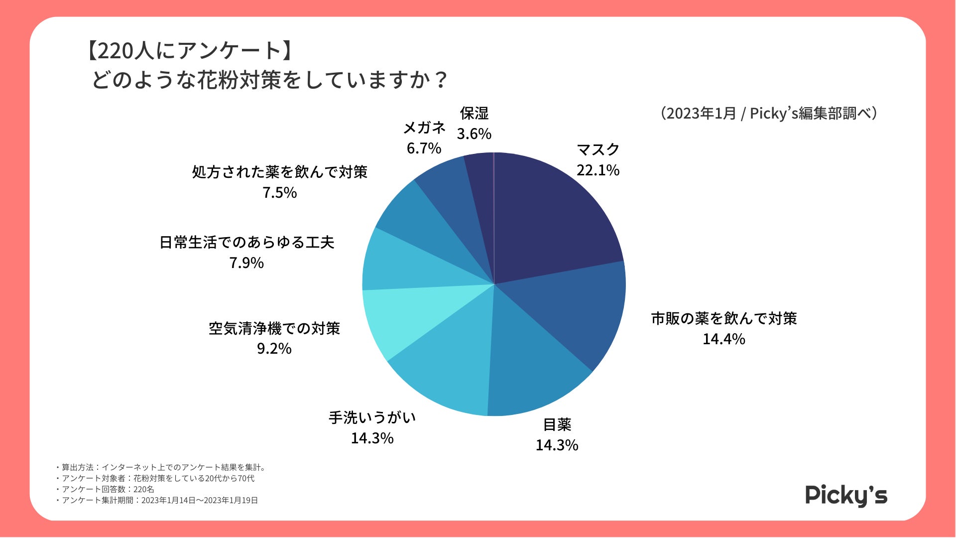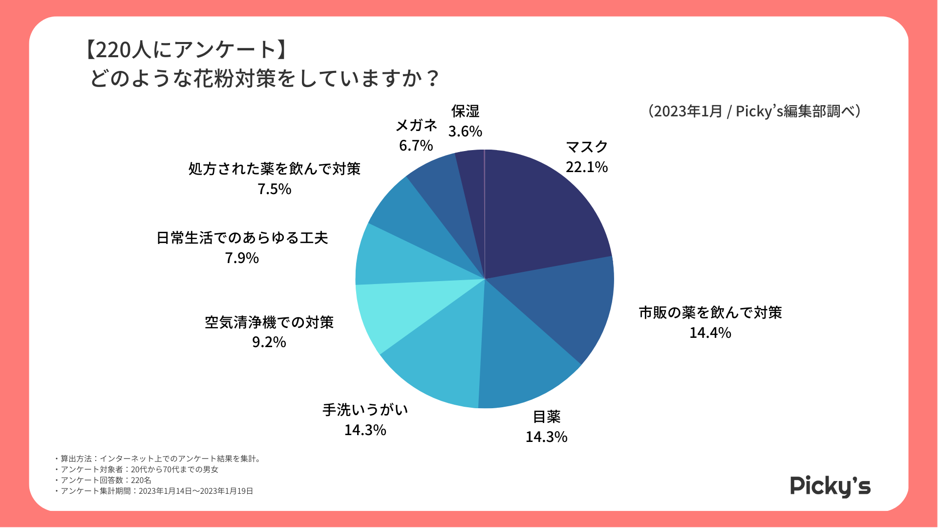 「Picky’s」は、インターネットショッピングにおいて、購入前に試せない・選ぶべきものがわからないという課題の解決を目標に、あらゆる商品のおすすめランキングや検証レビューを紹介するサイトです。このたびPicky’s(https://rentry.jp/note/)では、花粉対策についてインターネット上でアンケート調査を行いましたので発表いたします。