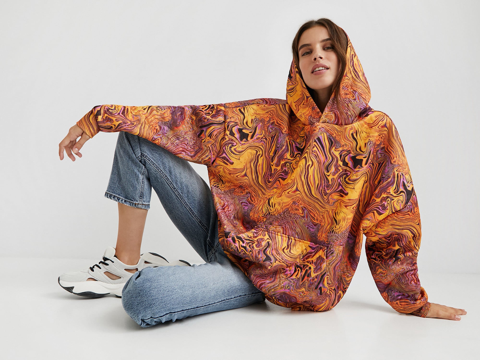 ARやメタバースなどのデバイスを介した仮想世界から着想を得たという彼女の作品には、2Dと3Dの両方のデザインソフトウェアを活用したマーブル模様のデジタルプリントがあしらわれています。また、素材にはリサイクルポリエステルを使用し、サステナブルなユニセックスウェアとなっております。
