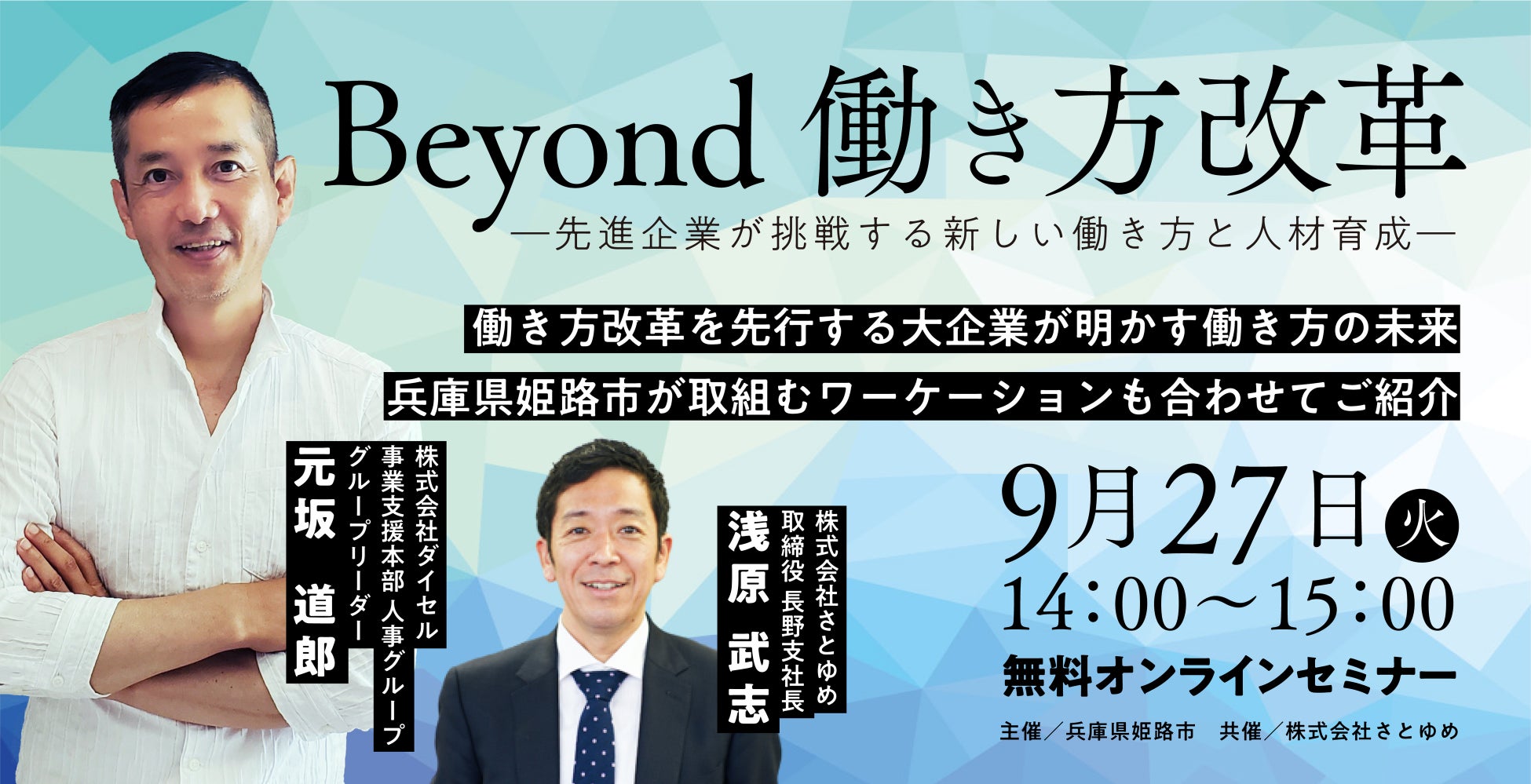 全国各地で地域活性化やビジネス創出を支援する株式会社さとゆめ(本社:東京都千代田区、代表取締役社長:嶋田俊平、以下「さとゆめ」)は、兵庫県姫路市とともに、ワーケーションを含む企業向け滞在プログラムを整備して、企業の働き方改革や健康経営を応援しています。今般、姫路市に拠点を持ち、働き方改革を積極的に進めている株式会社ダイセル(本社:大阪市、代表取締役社長:小河 義美、以下「ダイセル」)の人事部長 元坂道郎氏をお呼びして、Afterコロナ、DX時代の新たな働き方への挑戦をウェビナー形式でご紹介頂きます(2022年9月27日14:00-15:00;参加費無料)。また、姫路市とさとゆめが実施した働き方改革やワーケーションに係る調査結果、および姫路市のワーケーションプログラムもご紹介します。企業の人事や働き方改革などを担当されている方々にとって、他社の具体的な取組みや全体の潮流などを知っていただく貴重な機会になっています。是非ご参加ください!
