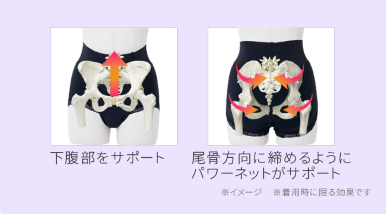 同時に、「お尻や膣の方向に引き締める」という骨盤底筋体操に用いられるサポートも行うため、緩んだ骨盤底筋を引き締め鍛えることも目指します。