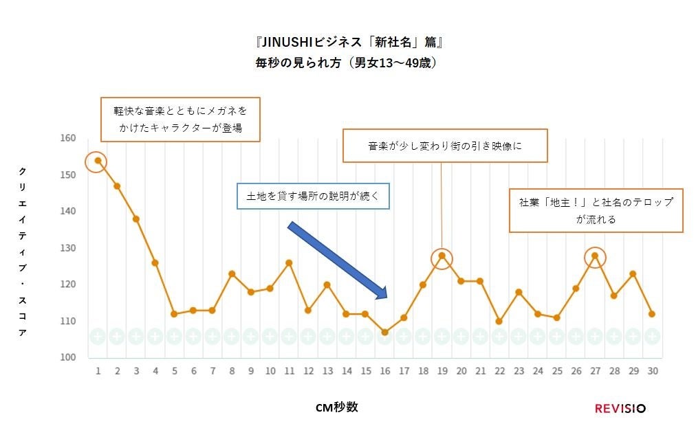 このCMは、前述したとおりタレントを起用せず、キャラクターのみが出演するCMです。冒頭、心地よい音楽とともにメガネをかけたキャラクターが登場するシーンが最も注目されました。その後、土地を貸す場所の説明が続くシーンでやや下がりますが、音楽が変わったり、引きのシーンになったりと変化することで、最後の社名テロップまで高い注目を保ちました。放送された局と時間帯が集中していたため、1秒目がかなり高いスコアとなり、その後低下するが引き続き高い水準をキープするという特徴的な波形となっています。