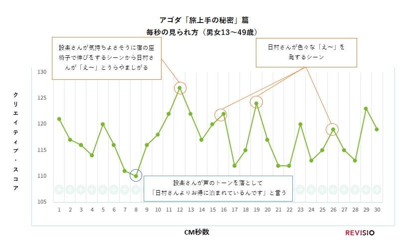 おトクに旅する設楽さんのおトク情報に「え~」を繰り返す日村さん。「え~」のところで注目度が高くなりました。日村さんの表情や繰り返し同じ表現がでてくることで、視線が集まったと考えられます。右下がりの波形となるCMが多い中で、何回も山ができ、最後まで飽きられていないCMでした。