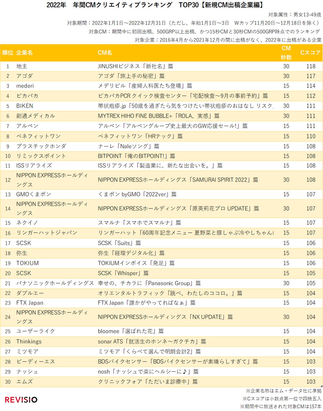 ご家庭に人体認識技術を搭載した機器を設置し、テレビの「視られている量」を測るREVISIO株式会社(所在地 :東京都千代田区、代表取締役社長 郡谷 康士、以下REVISIO)は、 テレビCMを中規模出稿している企業に絞り、2022年年間で視聴者の視線を釘付けにしたテレビCMクリエイティブのランキング「2022年 年間CMクリエイティブCスコアランキングTOP30【新規CM出稿企業編】」を公開しました。