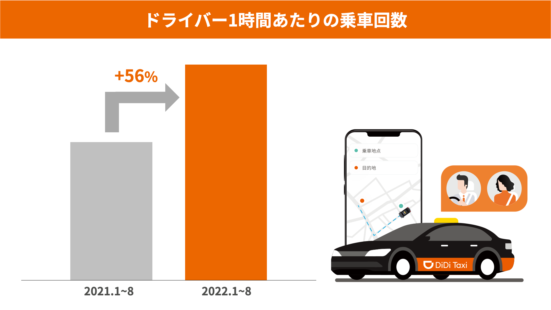 また、「DiDi」導入ドライバー1時間あたりの乗車回数についても、2022年1月〜8月で前年同期比+56%と増加しています。同時に、2台目として「DiDi」を導入し複数のアプリを併用する事業者様も含め、DiDiを新規でご利用いただくタクシー事業者様も増えてきています。利用者だけではなく、供給側であるタクシー事業者様にもこうした価値提供ができており、配車プラットフォームとして着実に成長を遂げています。