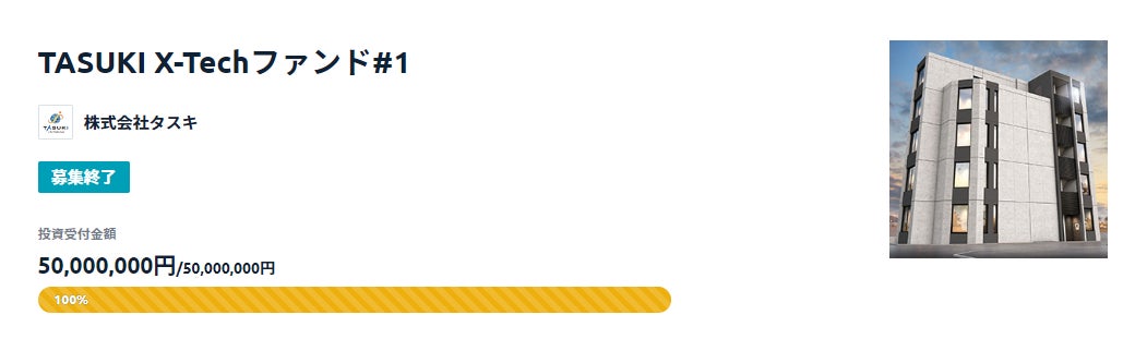株式会社タスキ(本社:東京都港区、代表取締役社長:柏村 雄、証券コード:2987)は、ファンズ株式会社(本社:東京都渋谷区、代表取締役CEO:藤田 雄一郎)が運営する企業に貸付投資ができる「Funds(ファンズ)」を通じて資金調達を行うこととし、「TASUKI X-Techファンド#1」にて5,000万円のファンド募集が開始されたところ、募集開始約12分で満額申し込みを達成いたしました。