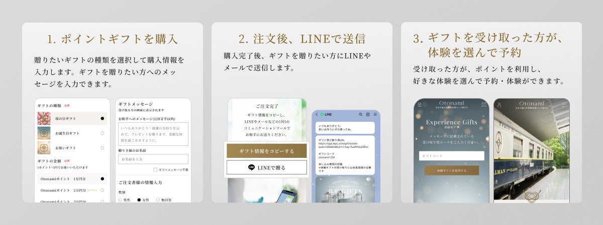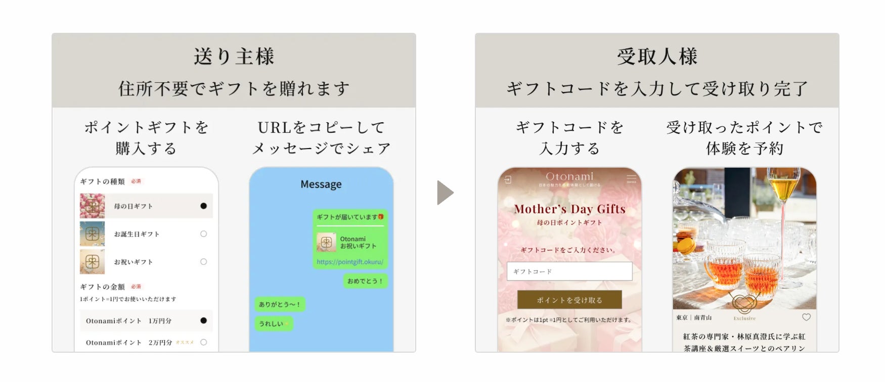 この新しいギフトは、従来の体験プランギフト制度を進化させ、贈る側が「Otonami」で利用可能なポイントを選び、受け取った人がそのポイントを使って約480プラン*あるOtonamiの特別体験の中からお好きなものを選べる仕組みです。これにより、ギフトを受け取った方が、直接自分の好みに合わせたモダンラグジュアリーで特別な体験を選べる楽しさが広がります。是非、5月11日の母の日に向けて、体験ギフトをプレゼントしてみてはいかがでしょうか?