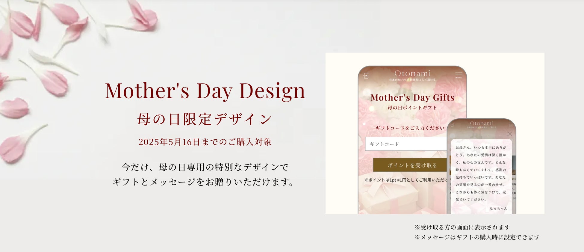 Otonamiの母の日ギフトは、贈る側がポイントを選び、受け取ったお母さんがご自身の好きな体験を選べる、新しいタイプのギフトです。