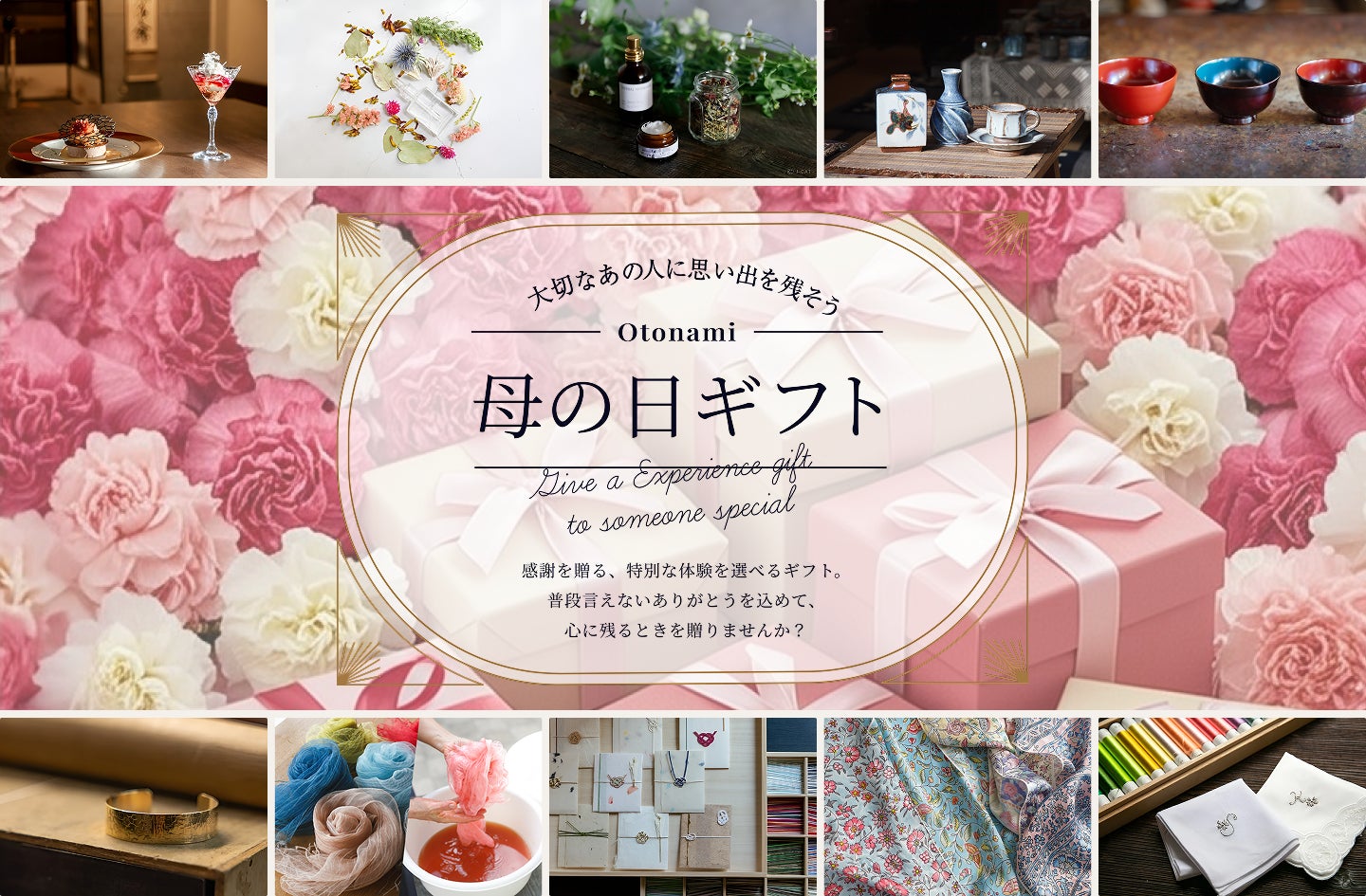 Otonamiの母の日ギフトなら、お母さんが自分の好きな体験を選び、心に残るひとときを過ごすことができます。忙しい日常から解放され、心を落ち着けるひとときとして、ひとりで静かな時間を楽しむのも、夫婦や親子で共に贅沢なひとときを過ごしながら、素晴らしい思い出を紡ぐのも、Otonamiの体験ギフトなら、どんなシーンにも寄り添い、心温まる贈り物となります。