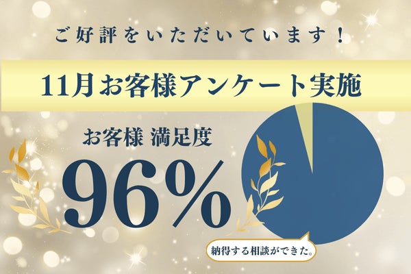 今回のアンケートでは、「サービス満足度」と「アドバイザーの対応満足度」の2つの項目で調査を実施しサービス満足度96%・アドバイザーの対応満足度95%と共に高い評価をいただきました。