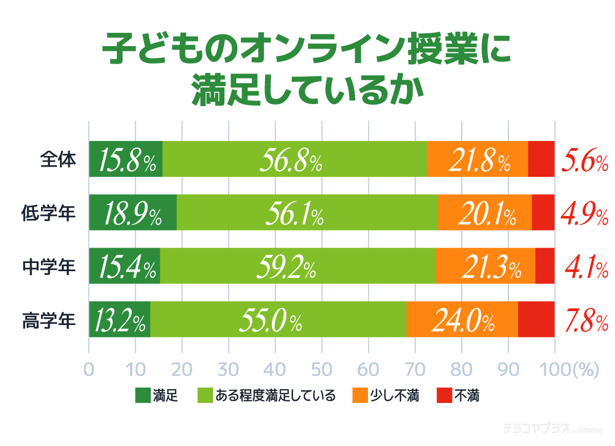 約7割の小学生の保護者が、子どものオンライン授業に満足しており、子どももオンライン授業に順応して集中して取り組んでいるようです。