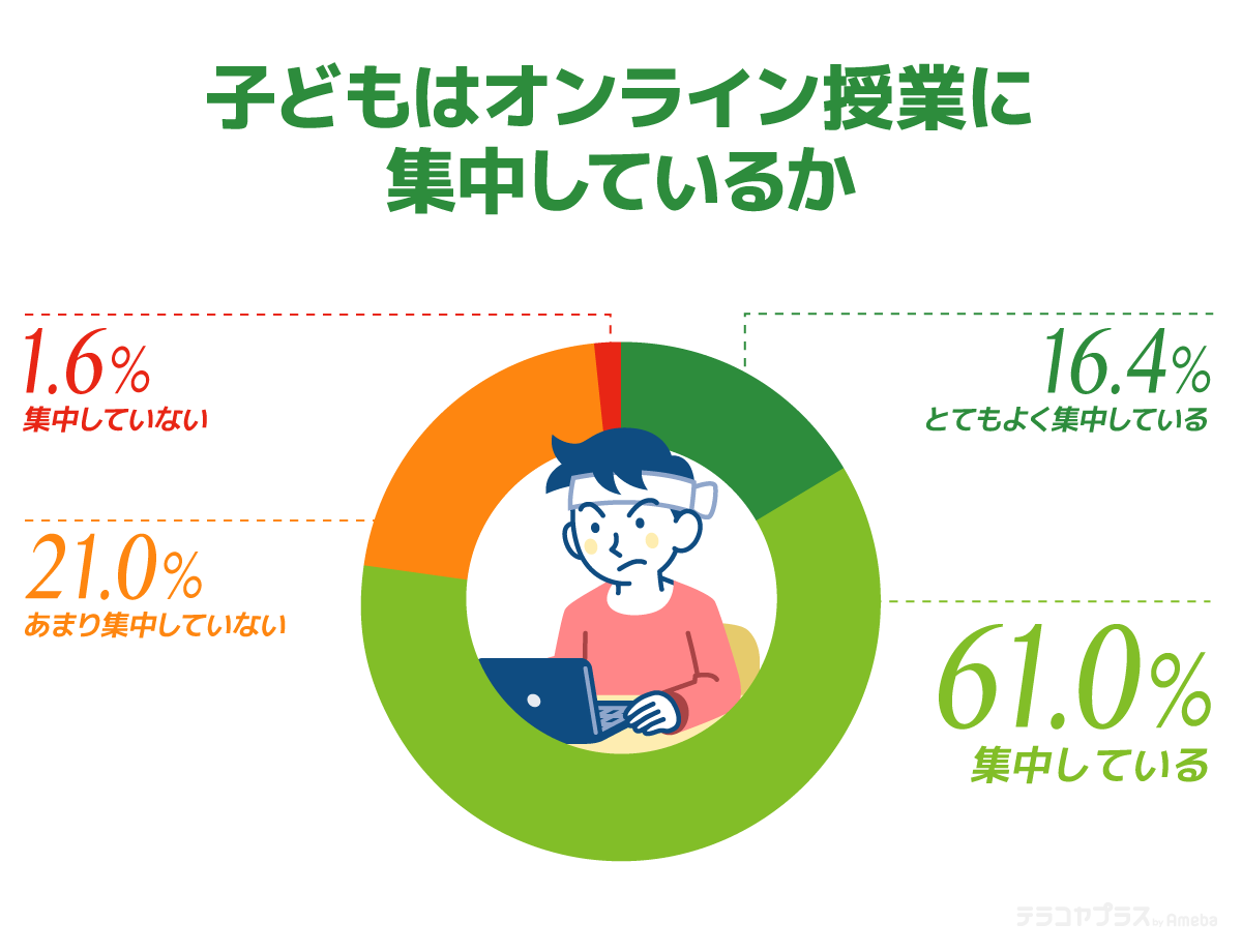 では、実際にオンライン授業を受ける子どもの様子を見て、保護者はどのような印象を受けたのでしょうか。子どもはオンライン授業に集中しているかどうか尋ねてみました。
