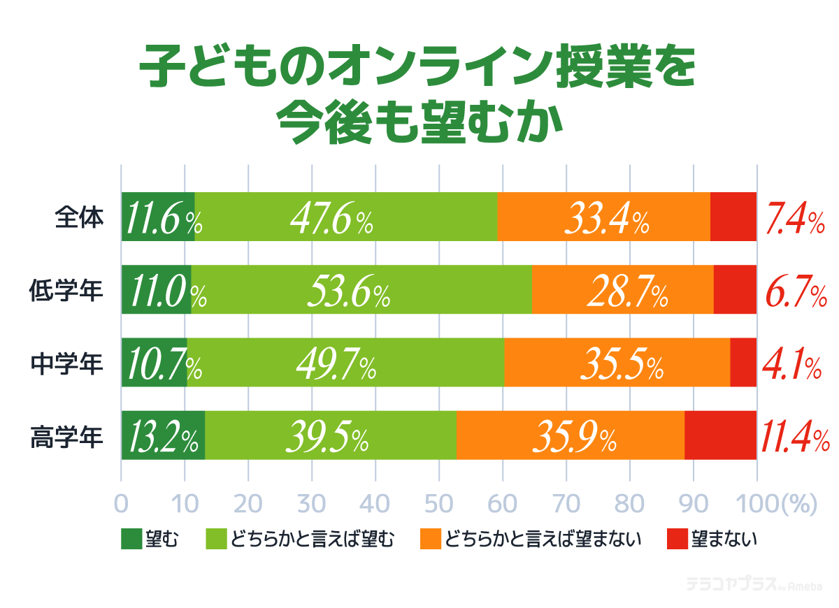 全体としては「望む」(11.6%)「どちらかと言えば望む」(47.6%)の計59.2%の保護者が、今後もオンライン授業を望んでいることが分かりました。