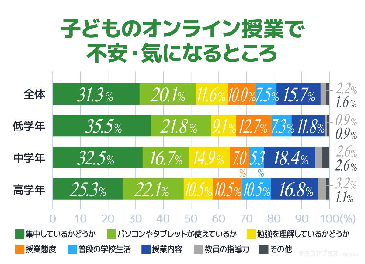 子どものオンライン授業に不安を抱いていたり、気になるところがある保護者にどのような点でそれらを感じるのか尋ねたところ、全体で最も多かったのは「授業に集中しているかどうか」(31.3%)、次いで「パソコンやタブレットが使えているか」(20.1%)でした。