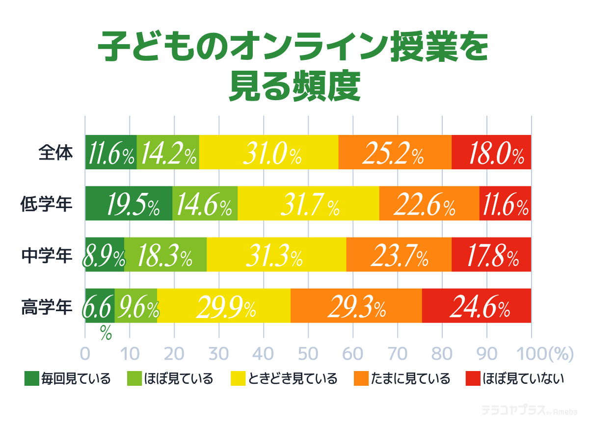 学年ごとに見てみると、低学年は「毎回見ている」が19.5%、「ほぼ見ている」が14.6%の計34.1%で、約3人に1人の保護者が子どものオンライン授業を頻繁に見ていることが分かりました。学年が上がるごとに頻繁に見ている保護者は少なくなります。