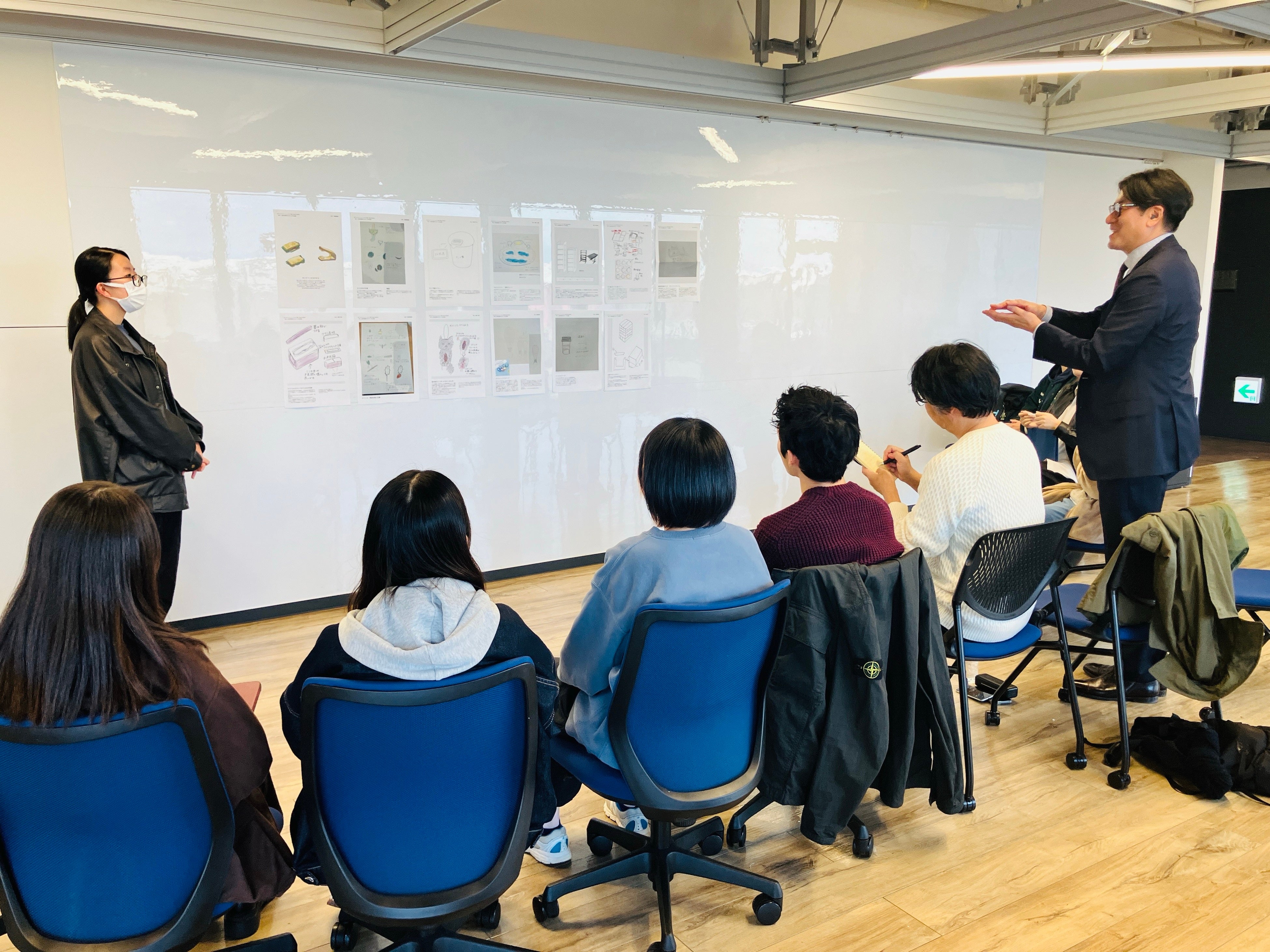 中間発表には、昨年度に続き当社から開発本部長の花畑嘉一とデザイン部長の湯浅将史が参加しました。両名は学生のスケッチを瞬時に読み取り、素材特性、構造、強度、量産性などの実務に基づく観点から、具体的かつ現実的なアドバイスを行いました。