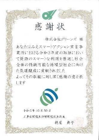三重県から感謝状「みえスマートアクション宣言事業所登録制度」