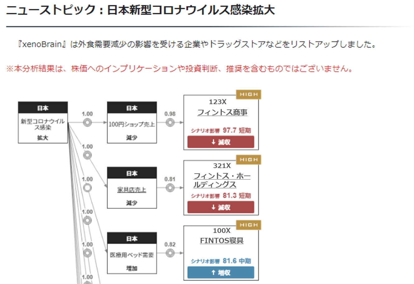 例えば「#感染第7波」といった事象に対し、関連する企業を相関図とともに提供します。