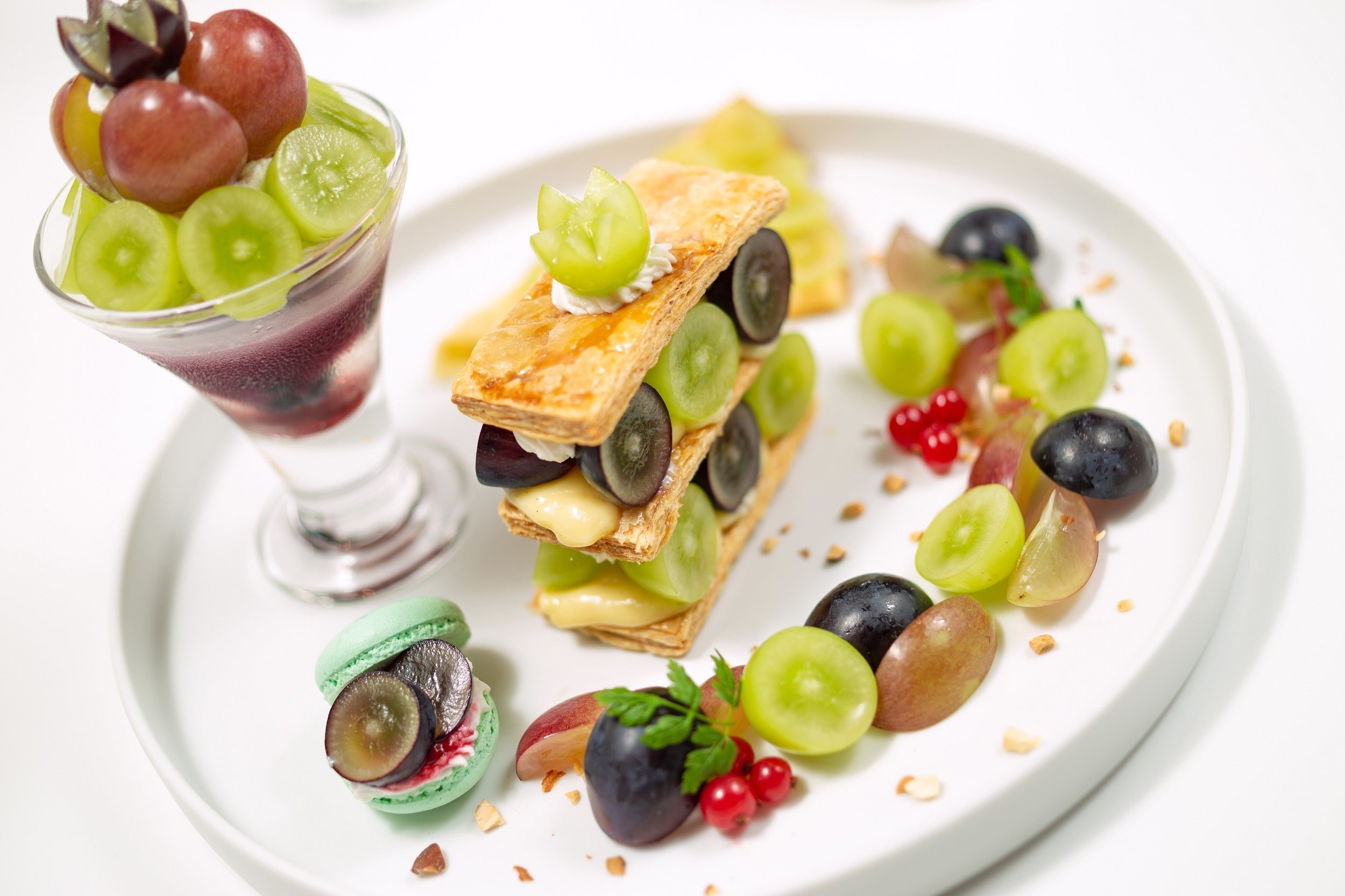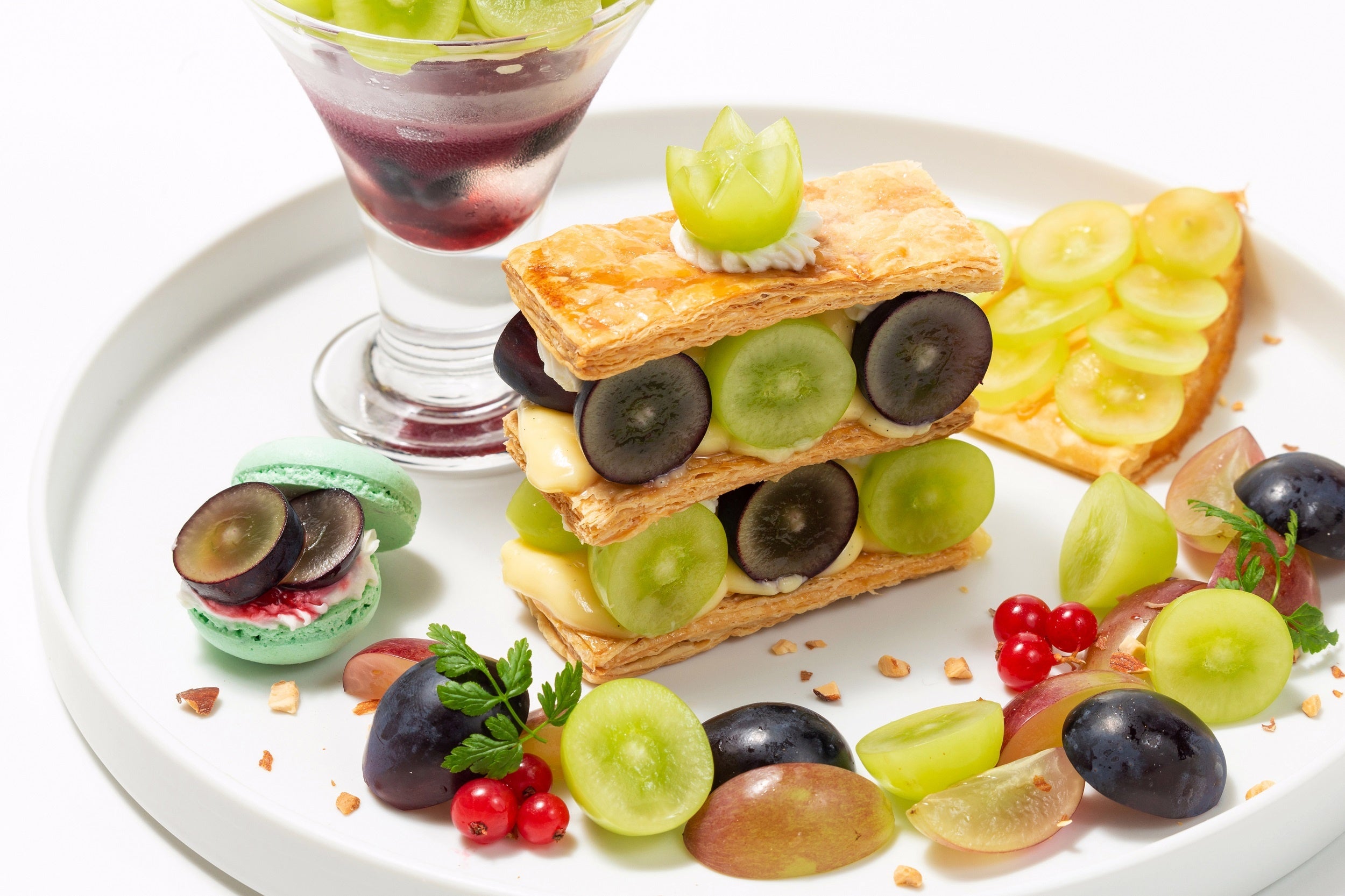 自家製の甘酸っぱいぶどうのコンフィチュールを使用した炭酸が爽やかな「スパークリンググレープ(ノンアルコールカクテル)」をはじめとして、フルーツと相性抜群のクリームとサクサクの生地を重ねた「シャインマスカットとナガノパープルのミルフィーユ」、グリーンと紫色の色合いが鮮やかな「ナガノパープルと抹茶マカロン」、キャラメルソースとシャインマスカットの組み合わせが楽しめる「シャインマスカットのキャラメルクレープ」、シャインマスカット・ナガノパープル・クイーンルージュの3色のぶどうを食べ比べできる「3種のぶどうミニパフェ」の計5種類のスイーツや飲み物で、ぶどうの様々な味わいをお楽しみいただけます。また、併せてセットになるコーヒー又は紅茶(ホット又はアイス)は、4種の中から1種が飲み放題となります。