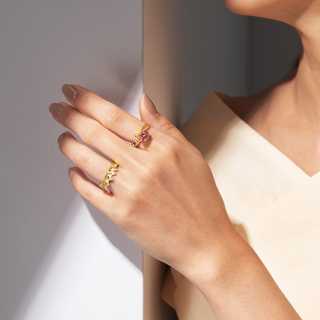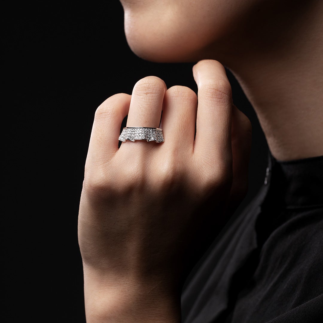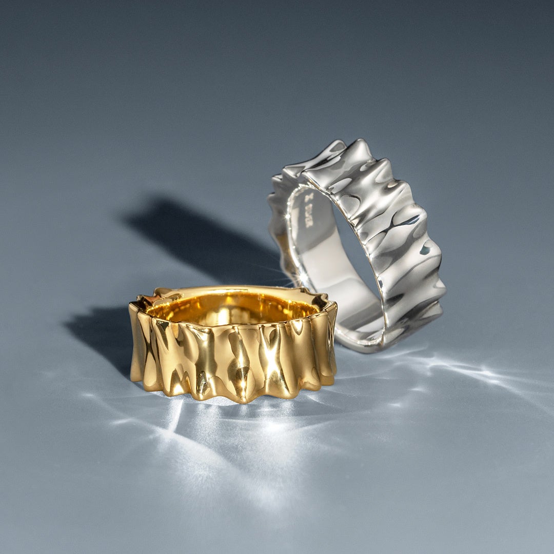 動くたび、ひらりと揺れて、空気をはらんで浮かび上がるシルエット。夜空に浮かぶオーロラの姿をフリルに見立て、その優雅な佇まいを再現した新作ジュエリー「フリル」。身体の中で最も動きがある指先にフリルを身につけることで、ゆらりふわりと、まるでジュエリーが動いているかのような質感を感じられるよう、有機的で自然な美しさを感じさせる凹凸の形状にこだわり抜きました。
