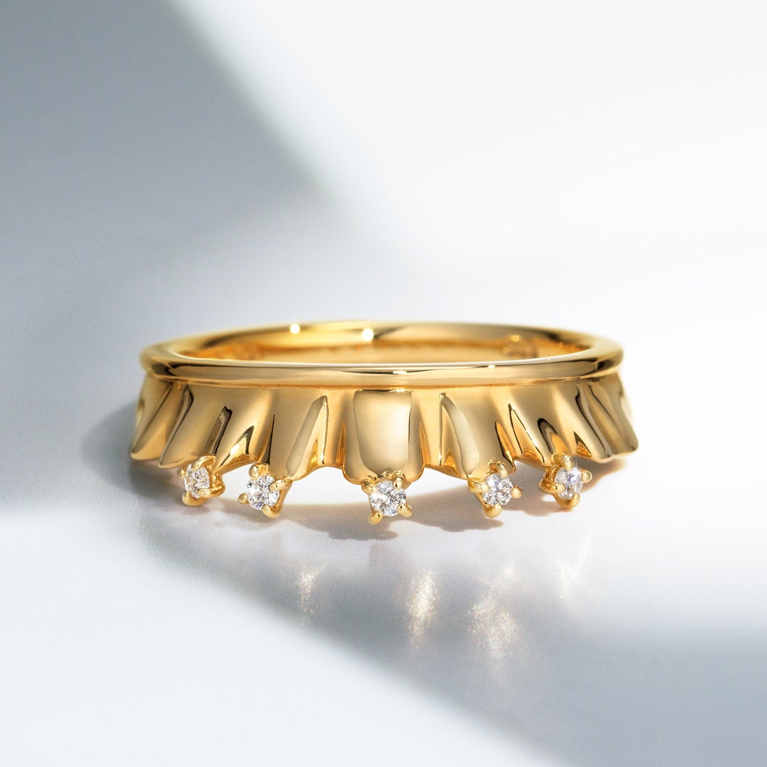 「ダイヤモンド K10/K18/PT リング・フリル」は、優雅なフリルはそのままに、たっぷりな地金を使用し、一見甘くなりそうなモチーフにシャープな輝きをもたらしたアイテムです。裾を揺らめかせる5粒のダイヤモンドは、より立体感を感じるように敢えて角度を変えて配置。日常の装いに取り入れやすい軽やかさと、遊び心溢れる存在感を、両立させたリングです。