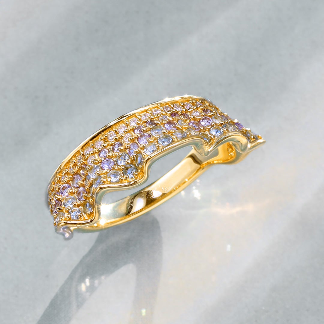 「マルチカラージュエル K18/PT リング・フリル(パヴェリング)」(写真上)は、フリルの柔らかに波打つ形状はそのままに、オーロラの淡く幻想的なグラデーションを、多彩なカラーストーンを通じて再現しました。使用した宝石は、ダイヤモンド(28ピース)に加え、タンザナイト(29ピース)、アクアマリン(33ピース)の、合計89ピース。自然なグラデーションを表現するため、絶妙な宝石の色の違いにもこだわり、1点1点選別したものを使用しています。