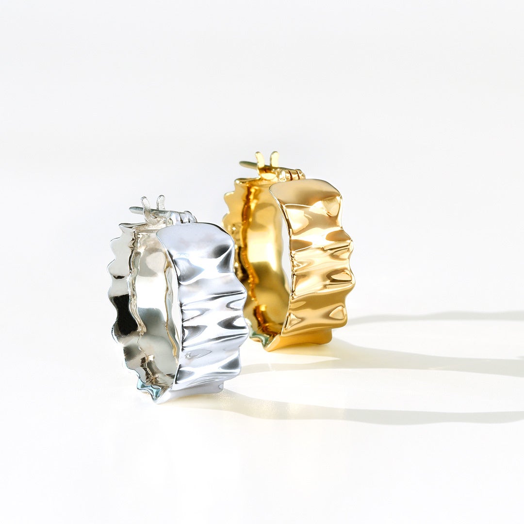 ファッションの中でもエレガントな表現のひとつである「フリル」は、贅沢な生地使いや、手間のかかるデザインだったことから、かつては貴族たちが性別問わず取り入れたディテール。そんなフリルのモチーフを、甘やかながらエッジの効いたデザインへと昇華させたシルバージュエリー「シルバー925/K18コーティング リング/ピアス(片耳)・フリル」は、合わせる装いに呼応して印象も変化します。カジュアルな装いなら、ソフトで上品な印象を引き立て、エレガントな装いには、スパイシーなアクセントへと変わるからこそ、ファッションのテイストや性別を選ばず身につけていただけます。