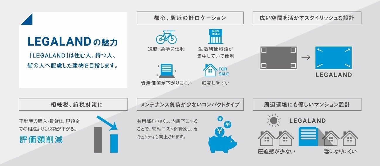 都心、駅近の好ロケーション、広い空間を活かすスタイリッシュな設計、相続税や節税対策としての活用、また、メンテナンスの負荷が少なく、周辺環境にも優しい設計を提案し、「LEGALAND」は住む人、持つ人、街の人へ配慮した建物を目指します。