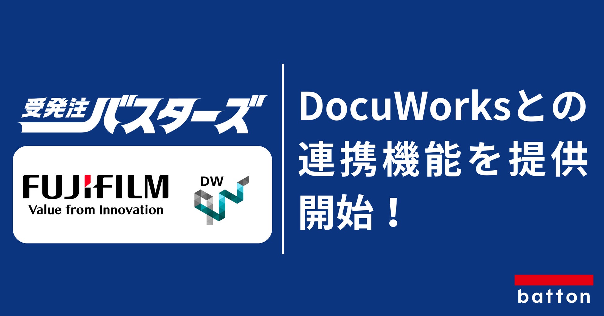 株式会社batton(本社:東京都港区、代表取締役:川人寛徳、以下「batton」)は、富士フイルムビジネスイノベーション株式会社(本社:東京都港区、代表取締役社長・CEO:浜 直樹、以下「富士フイルムBI社」)が提供するドキュメントハンドリングソフトウェア「DocuWorks」と連携する新機能「DocuWorks Sync for 受発注バスターズ」をリリースいたしました。本機能により、DocuWorks Desk内の特定フォルダにアップロードされた帳票が、自動的に受発注バスターズに取り込まれ、データ化されます。これにより、企業の受発注業務の効率化とデジタル化が一層促進されます。