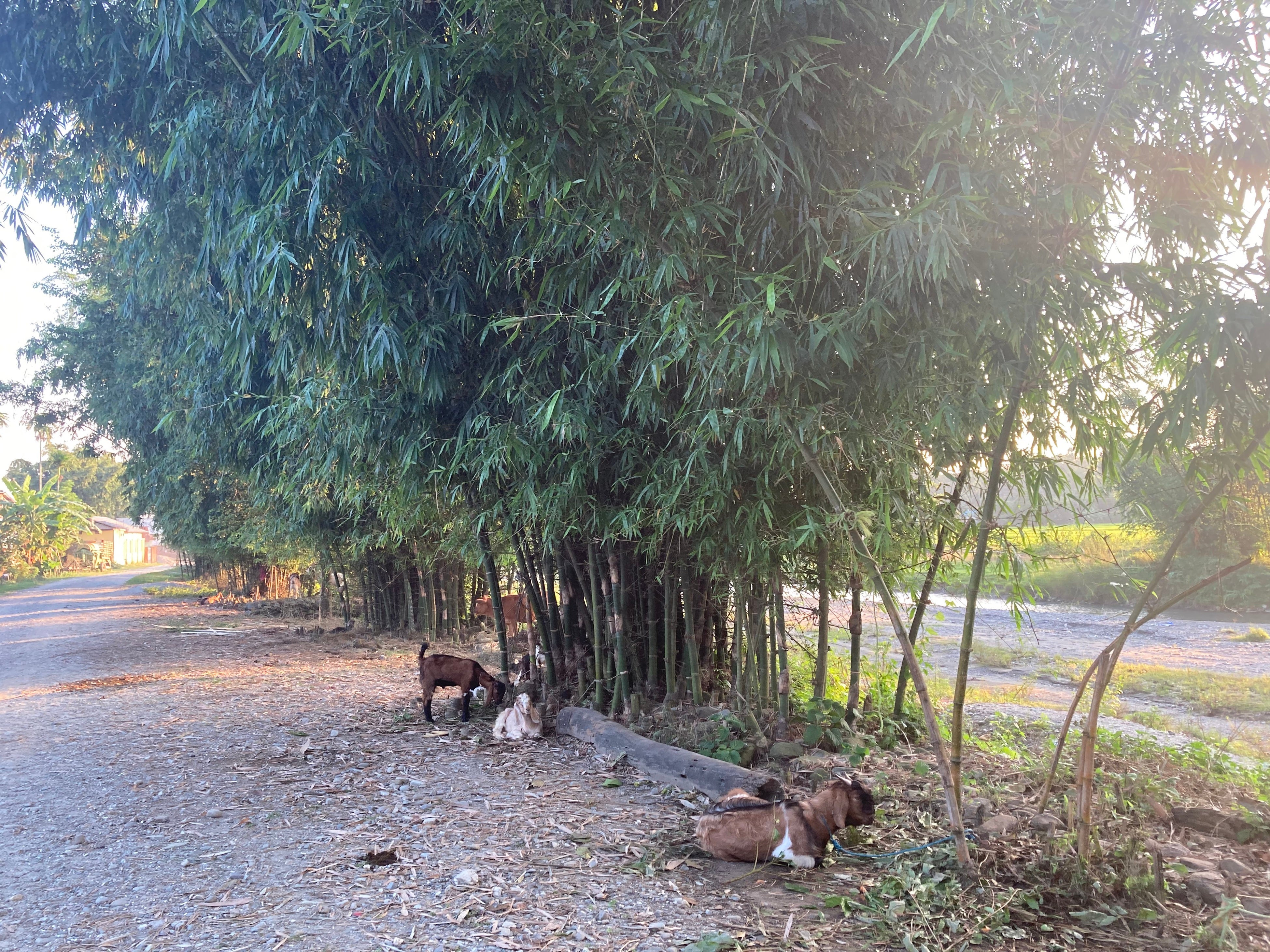 モラン郡の風景。2つの河川が合流する地点でも河岸整備はされていない。近くには住居がある