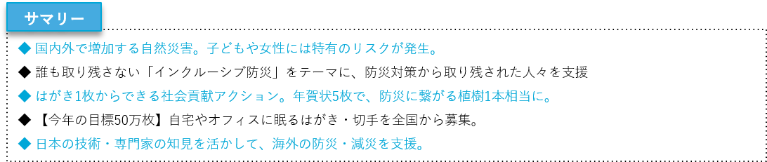 不要なはがきで防災×ジェンダー平等を推進。自然災害・人災から地域とリスクの高い女の子を守る「あなたのはがきが、だれかのために。キャンペーン」実施。日本の技術を届け、インクルーシブ防災の実現へ