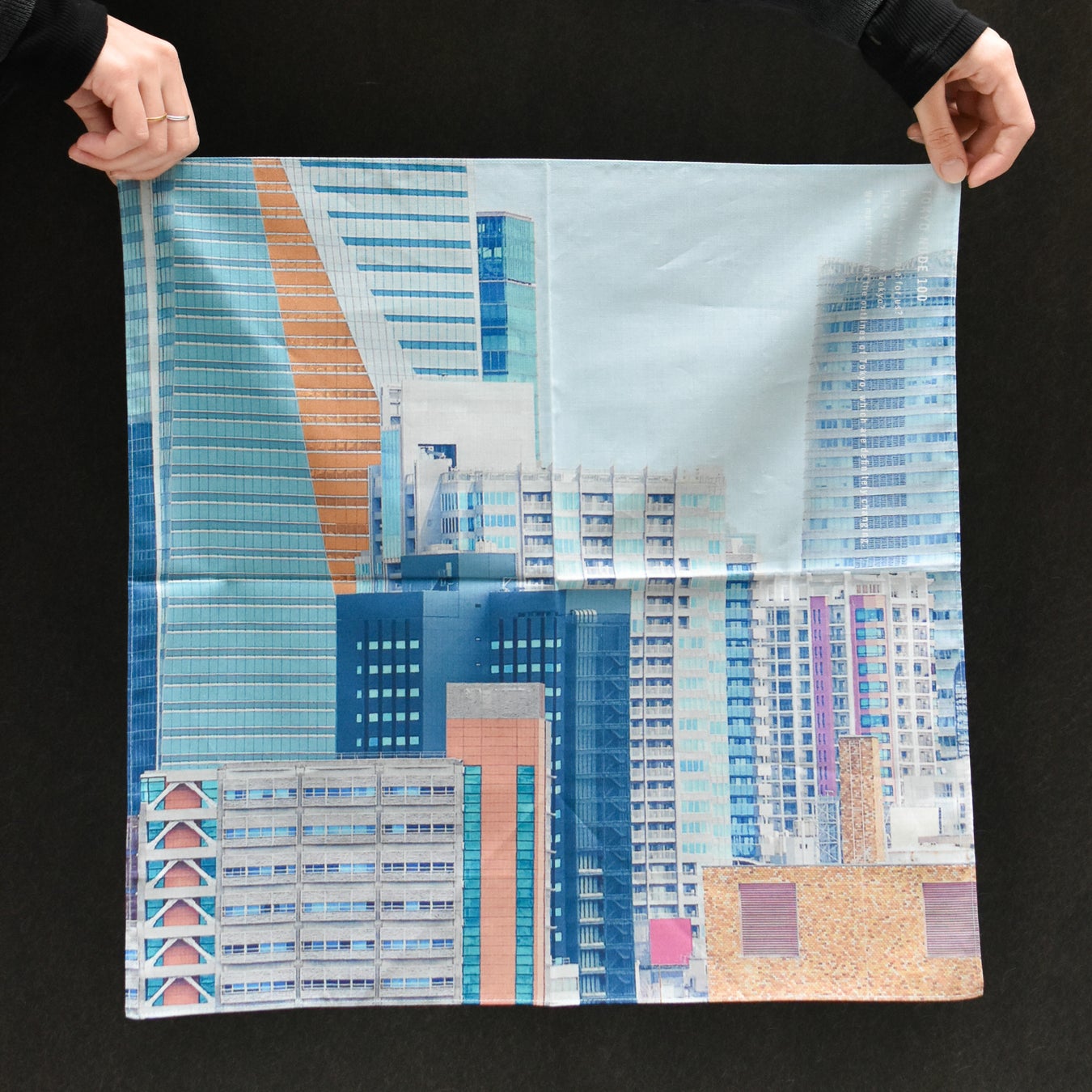 44.5×44.5cmの使いやすいサイズで実用性があり、高層ビルと一軒家が立ち並ぶ都会のワンシーンを切り取った、華やかで美しい一枚に仕上げています。