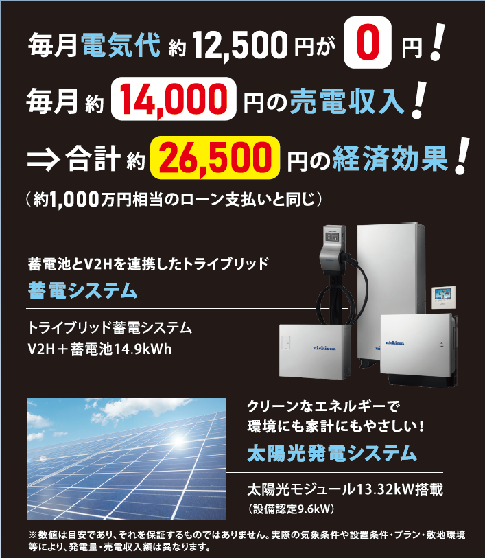 蓄電池とV2Hを連携したトライブリッドと太陽光発電システムを採用、住まう人も地球環境も守る家に