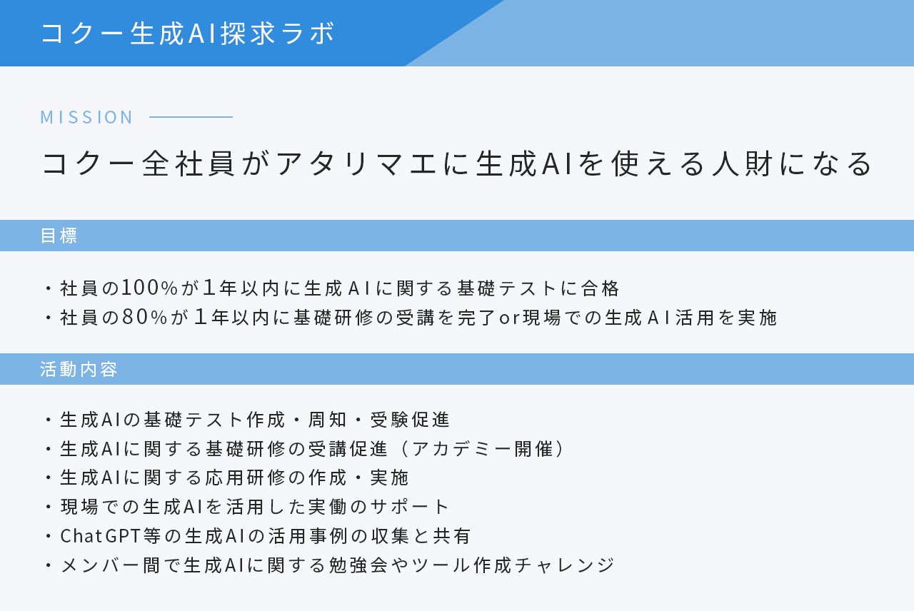 この成果を活かし、更なる生成AI活用の検証を行うため「コクー生成AI探求ラボ」を発足。生成AI活用の最新情報キャッチアップと社員への教育研修を引き続き行ってまいります。