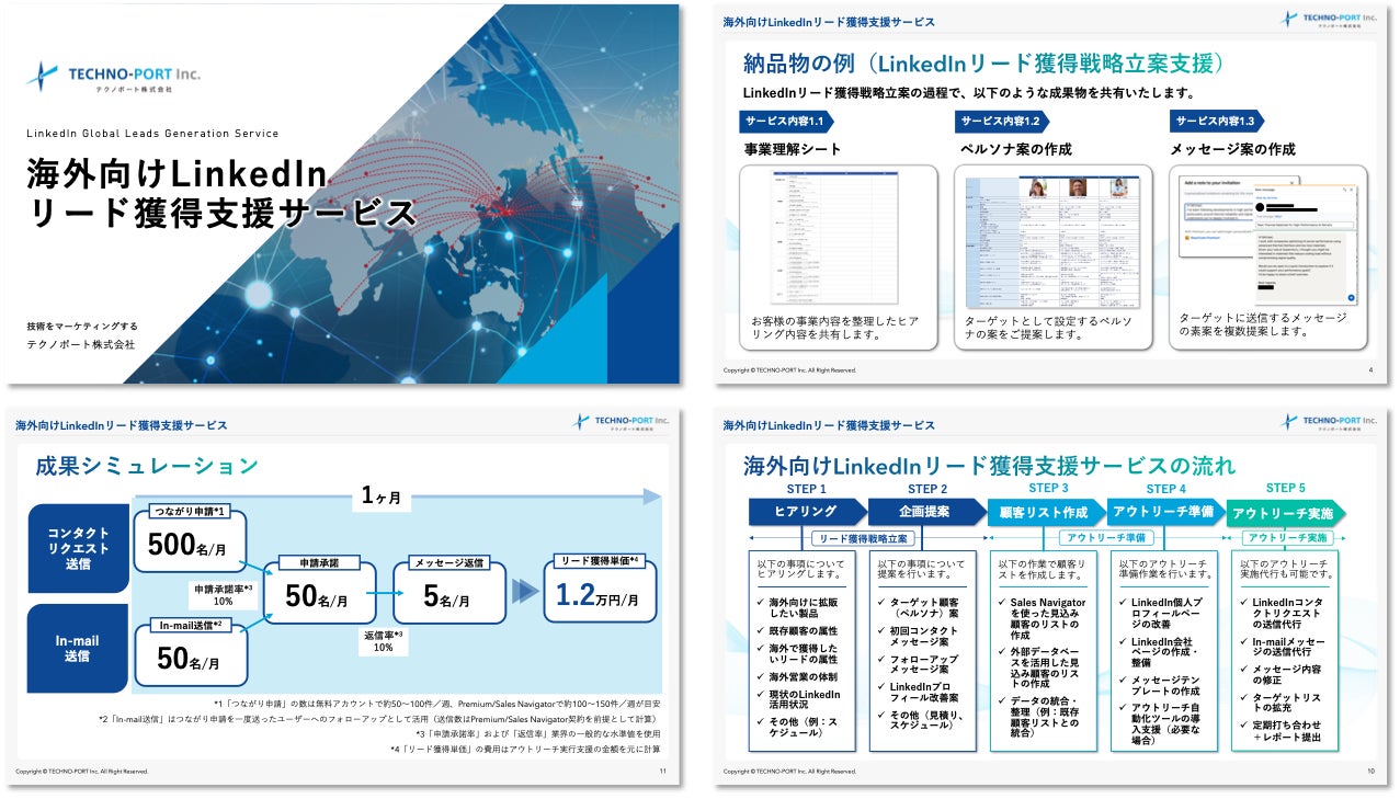 そんなお悩みをお持ちの企業様に向けて、LinkedInを活用した海外BtoBリード獲得をサポートするのが本サービスです。海外マーケティングの知識がなくてもご安心ください。戦略づくりから実際の顧客アプローチ(メッセージ送信)まで、すべて一貫して支援します。