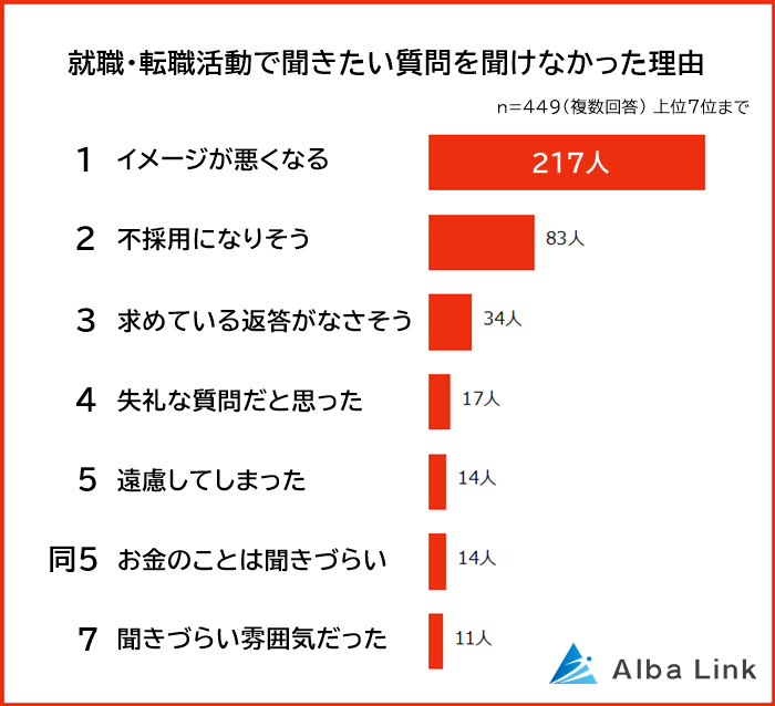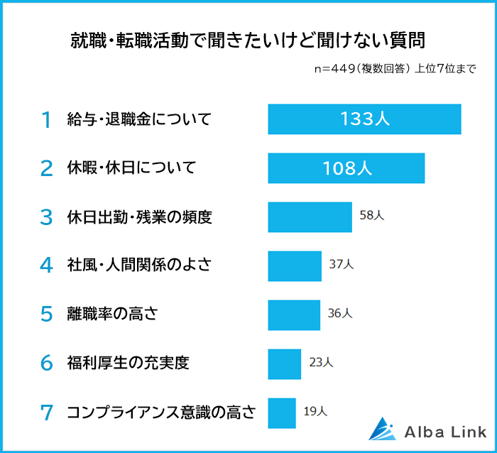 株式会社AlbaLink(本社:東京都江東区、代表取締役:河田 憲二)は、就職活動・転職活動をしたことがある449人を対象に「就職・転職活動中に本当は聞きたいけど聞けない質問に関する意識調査」を実施し、そのデータをランキングにしました。