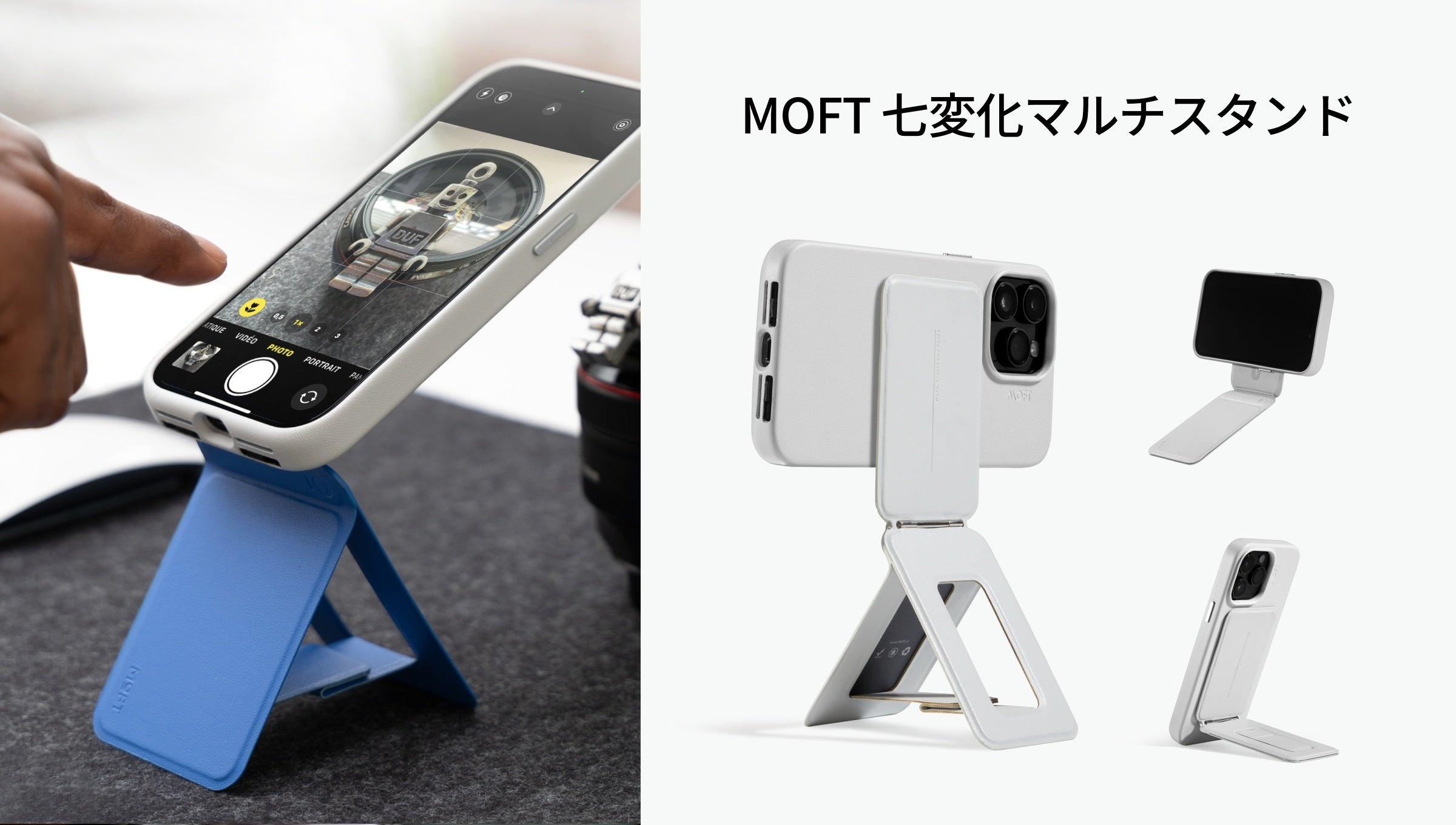 進化し続けるMOFTの「見えない、感じない、気づかない」というデザインコンセプトの下、新たに誕生したスマホスタンド。まさに“七変化”するモードと角度によって、どこにいても撮影を開始することができます。