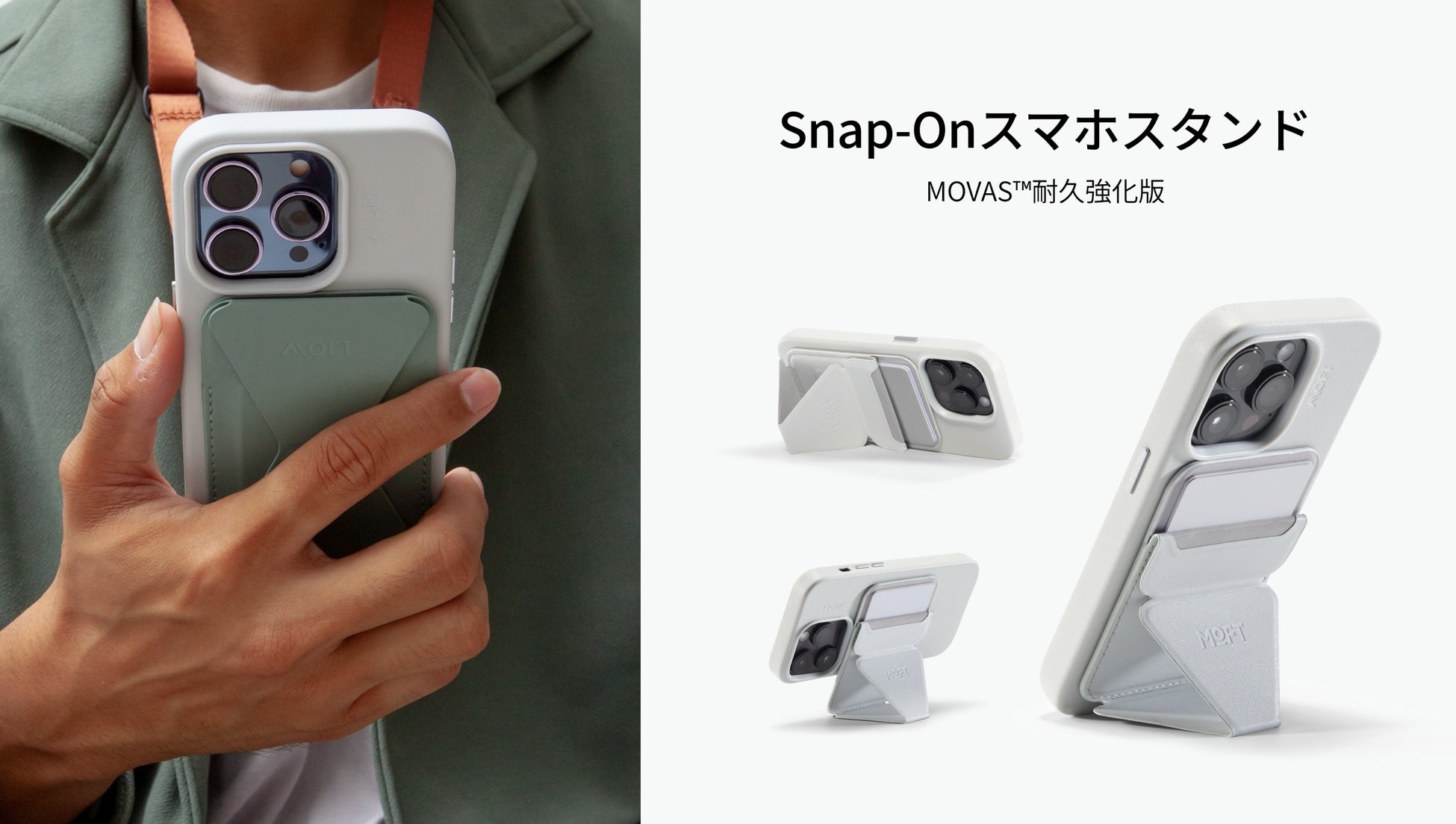 スマホスタンド、グリップ、カードケースがすっきりひとつになりました。MOVAS™採用で触り感と磁力がアップグレード。