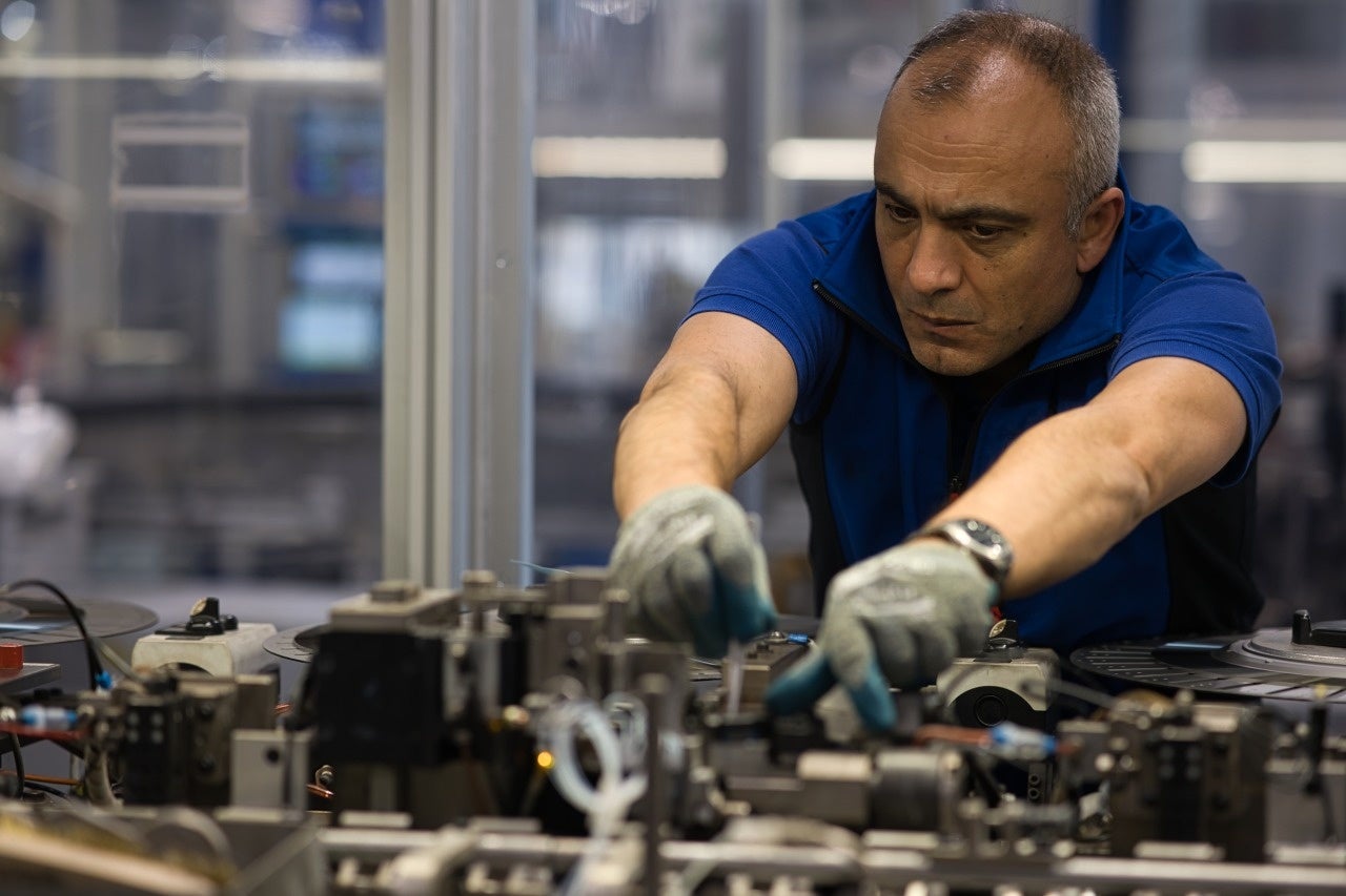 ドイツ・ゾーリンゲンの工場内では、製造機器や、鉄を引く研削盤、組立機械など、すべて自社のチームによって