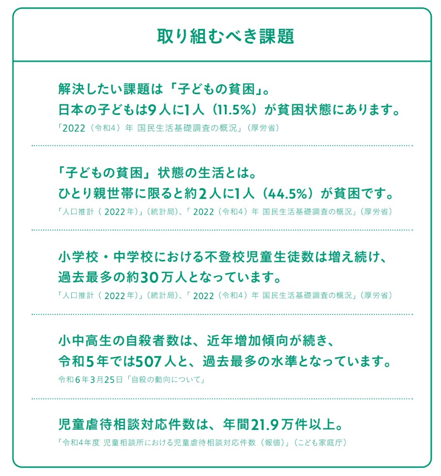 「子どもの貧困に、本質的解決を。」をミッションに掲げ、困難を抱える子どもたちへ学習支援と居場所づくりを展開しています。設立から延べ11,800人の子どもたちに支援を届けてきました。そして、地域の様々なステークホルダーと協力をしながら「つながり」「学びの環境」「育まれる環境」を整備し、6歳から18歳の子どもたちの生活圏に必要なすべての支援・機会がそろう「地域協働型子ども包括支援」のモデル構築。本モデルを全国へ広げ、すべての子どもたちが自分の可能性を信じ、 自分の力で人生を切り拓くことのできる社会の実現を目指しています。