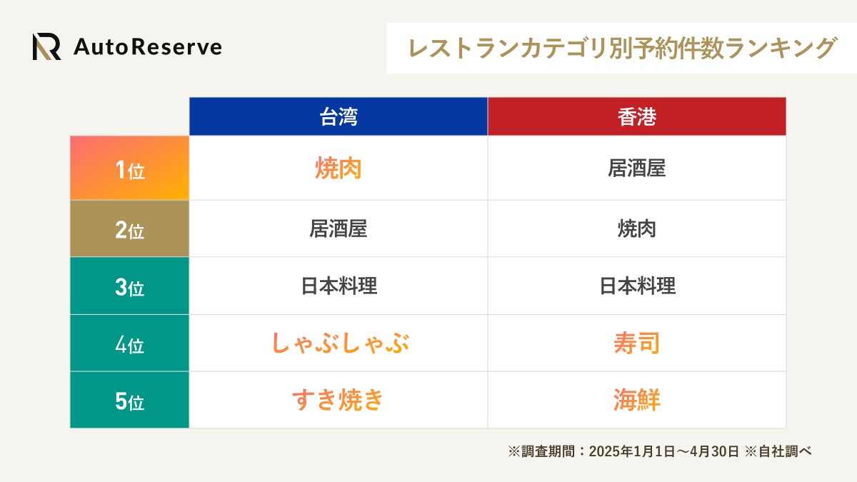 レストランのカテゴリ別に見たランキングでは、台湾と香港のそれぞれの国民性が反映された結果となりました。台湾では「寿司・海鮮」といった日本を象徴するカテゴリがランクインせず、「焼肉・しゃぶしゃぶ・すき焼き」といった温かい肉類の料理カテゴリが上位を占めました。これは、台湾の食の傾向として「温かいものを好む」ことに起因していると推測できます。