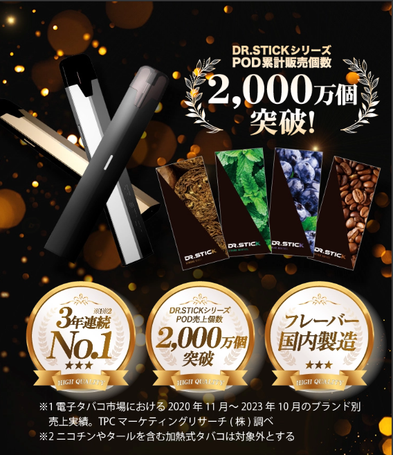 DR.STICK は、シリーズPOD累計販売個数2,000万個を突破し、「電子タバコ売上3年連続No.1」を達成した次世代のブリージングデバイス®です。 ニコチン・たばこ臭フリーでありながら「ガツン」とした吸い応えを実現し、多くの支持を集めています。