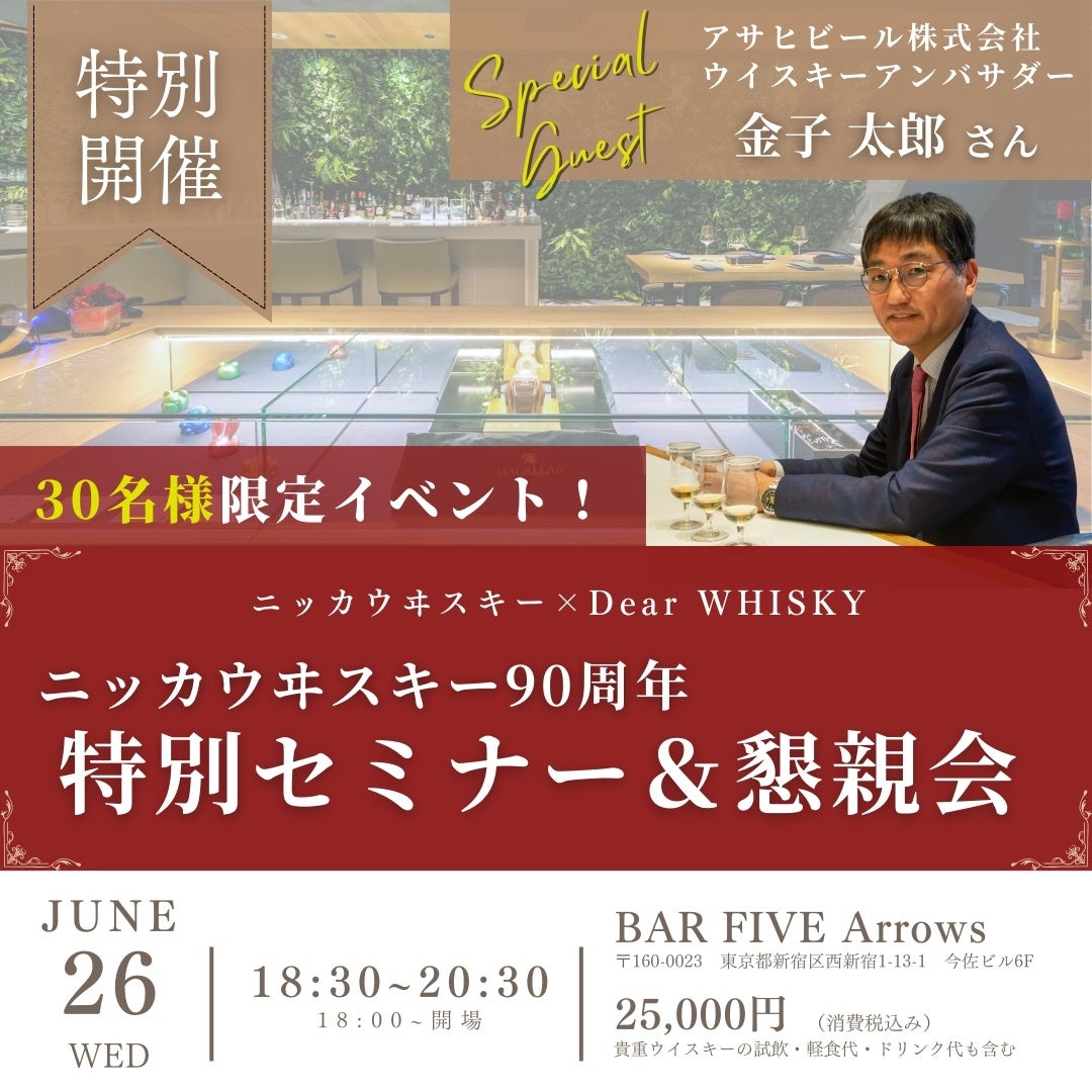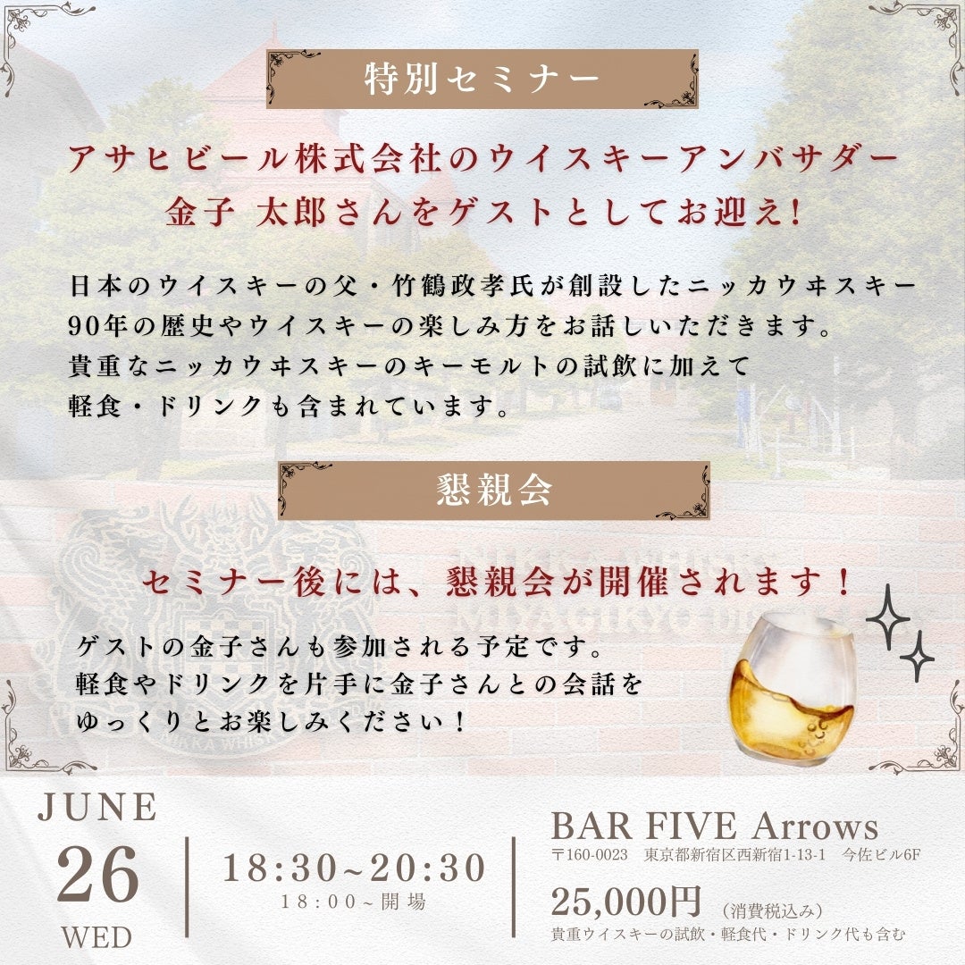 2024年6月26日(水)、BAR FIVE Arrows にて「ニッカウヰスキー特別セミナー・交流会」を開催いたします!ウイスキーアンバサダーである金子太郎さんをスペシャルゲストとしてお迎えして、今年で創業90周年を迎えたニッカウヰスキーのこれまでの歩みやニッカウヰスキーの魅力を紐解きます。ニッカウヰスキーのキーモルトの試飲に加え、セミナー後に開催される懇親会ではお食事・ドリンクもお楽しみいただけます!ご参加を希望される方は抽選となりますので、下記より6月21日(金)23:59までにお申し込みください!
