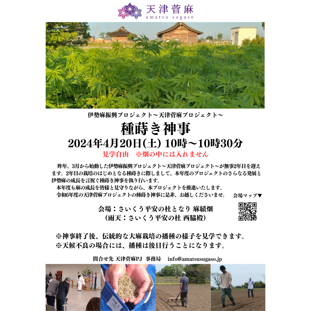 今回は、麻の歴史と文化の継承を目的に、神事用の大麻や、精麻、麻糸、麻布のための麻を栽培する「さいくう平安の杜西側斎宮寮栽培地」にて、種蒔神事を執り行います。神事は、麻の神様を祀る「竹神社(三重県明和町斎宮)が行い、麻の成長と天津菅麻PJの発展を祈願します。神事終了後は、伝統的な大麻栽培の播種の様子が見学できます。