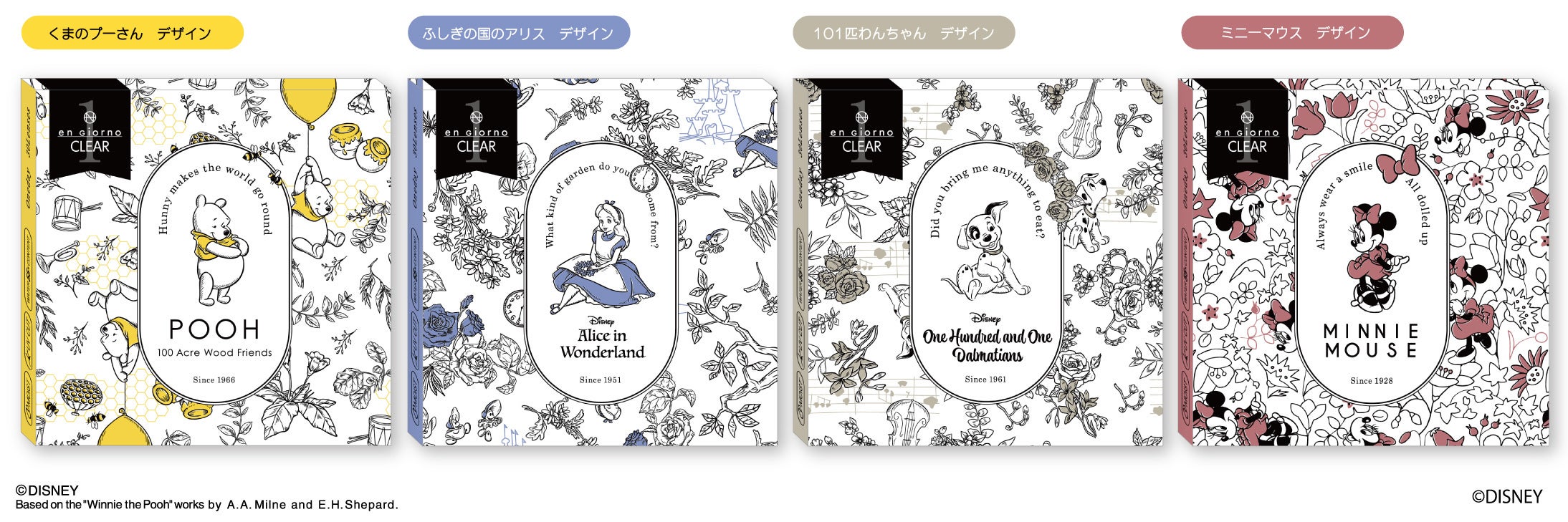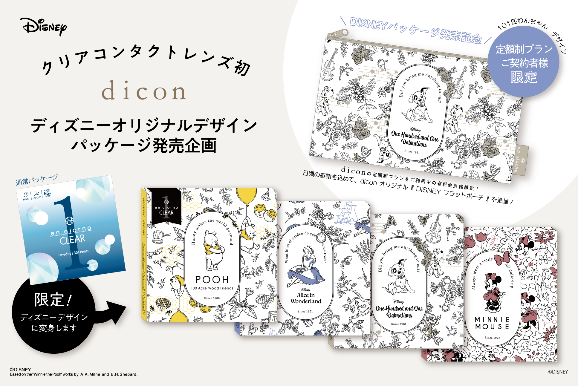 この度dicon限定として、「くまのプーさん」「ふしぎの国のアリス」「101匹わんちゃん」「ミニーマウス」のキャラクターが、かわいいオリジナルデザインパッケージになりました。