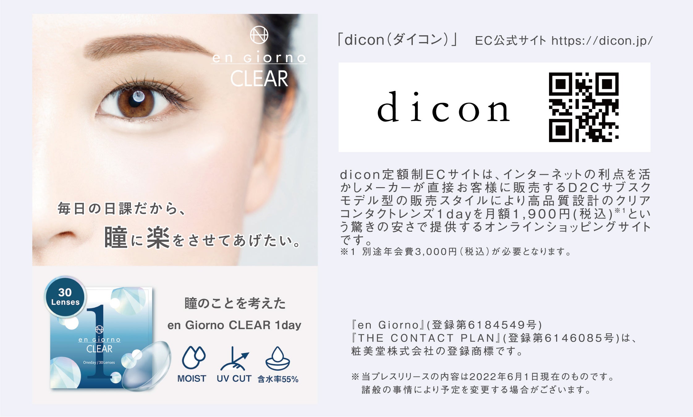 「dicon」は、高品質設計のクリアコンタクトレンズ1dayを月額1,900円(税込)※3 という驚きの安さで提供するD2Cサブスクモデル型のオンラインショッピングサイトです。