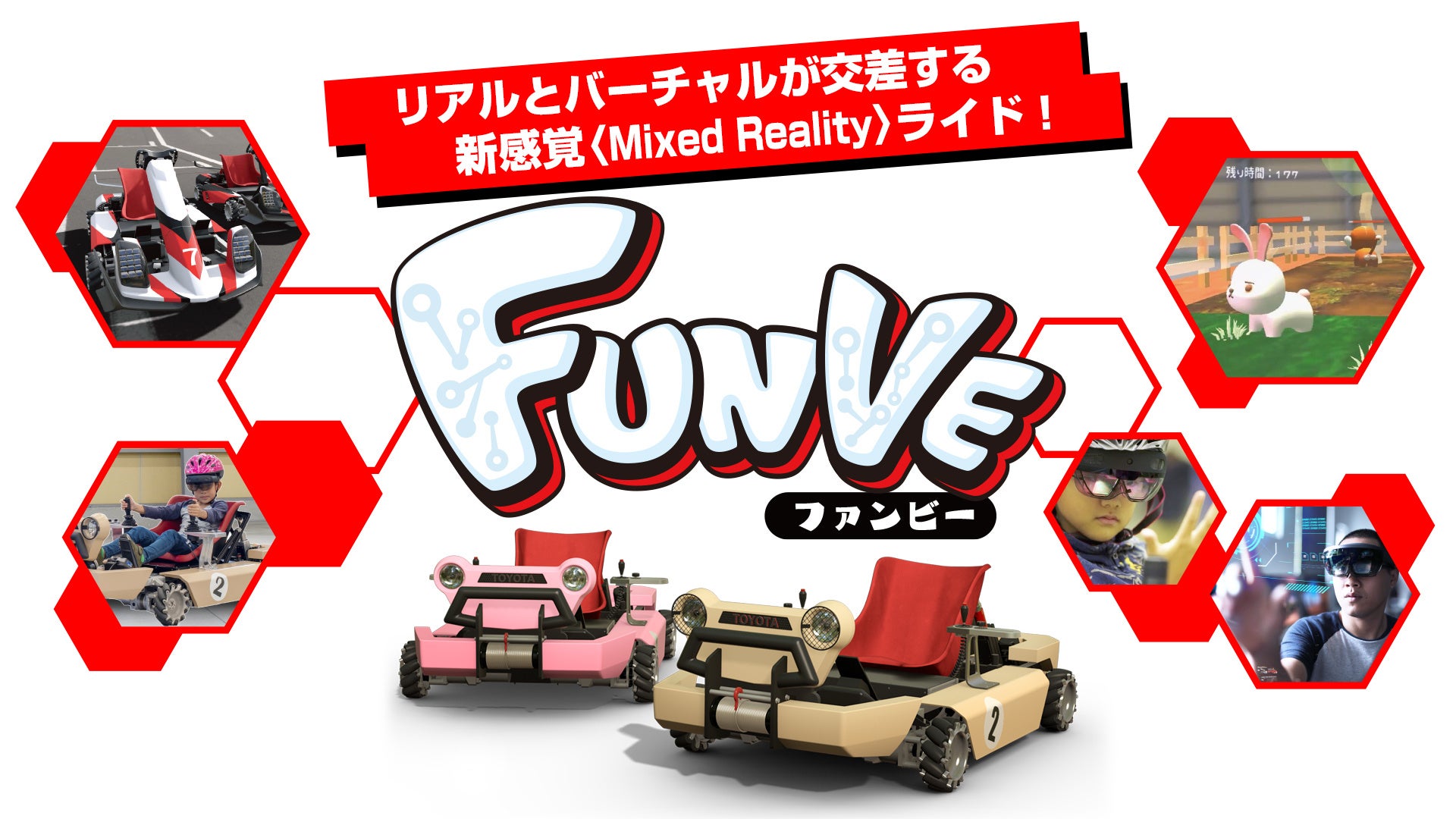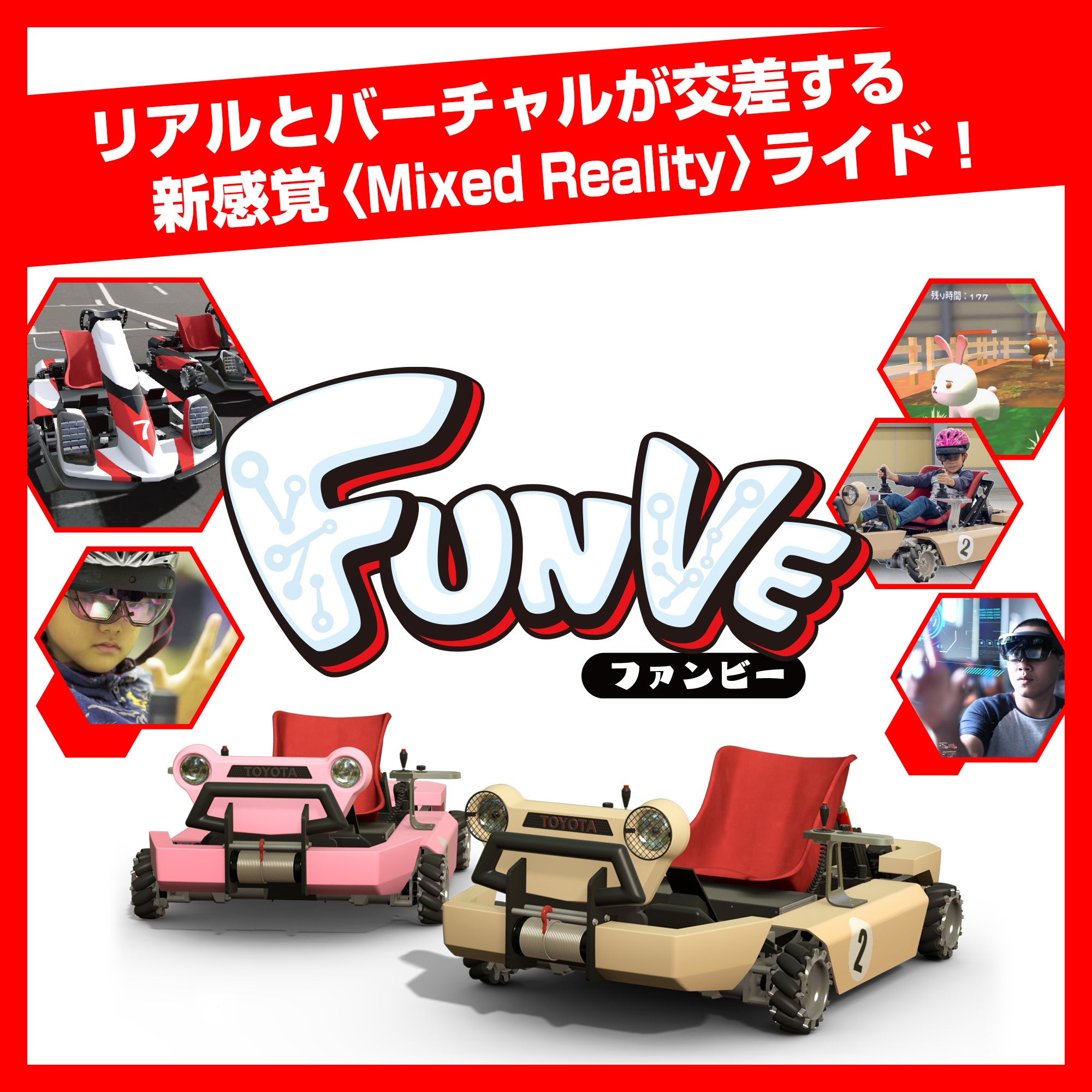 『FUNVE』は、トヨタ自動車株式会社 新事業企画部が制作する、リアルとバーチャルが融合した次世代の体験型アクティビティで、ユーザーはMR※グラス(マイクロソフト社製HoloLens2)を着用してカートに乗り、目の前に広がる仮想空間を実際のカートを操作して体験します。